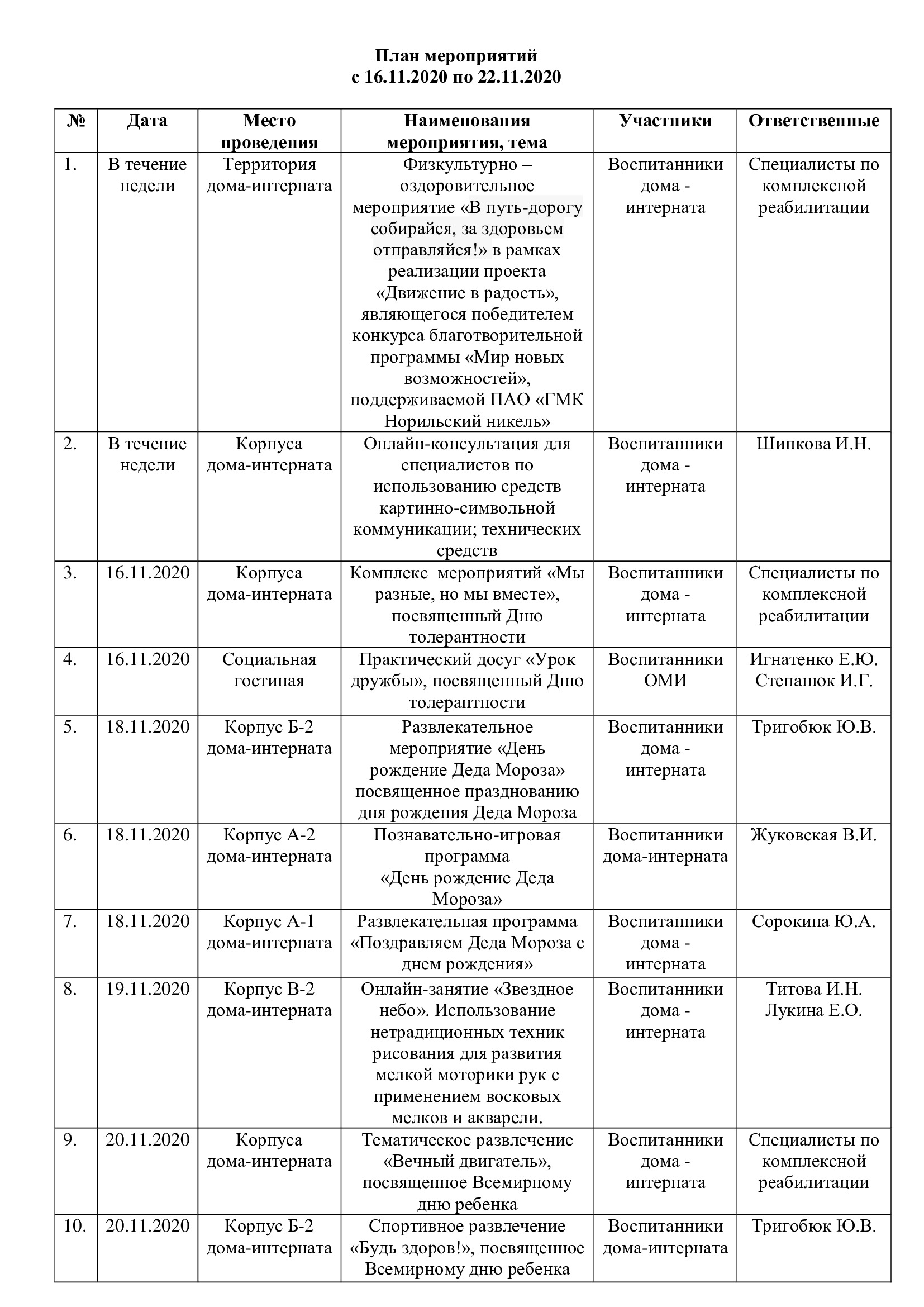 План мероприятий с 16.11.2020 по 22.11.2020