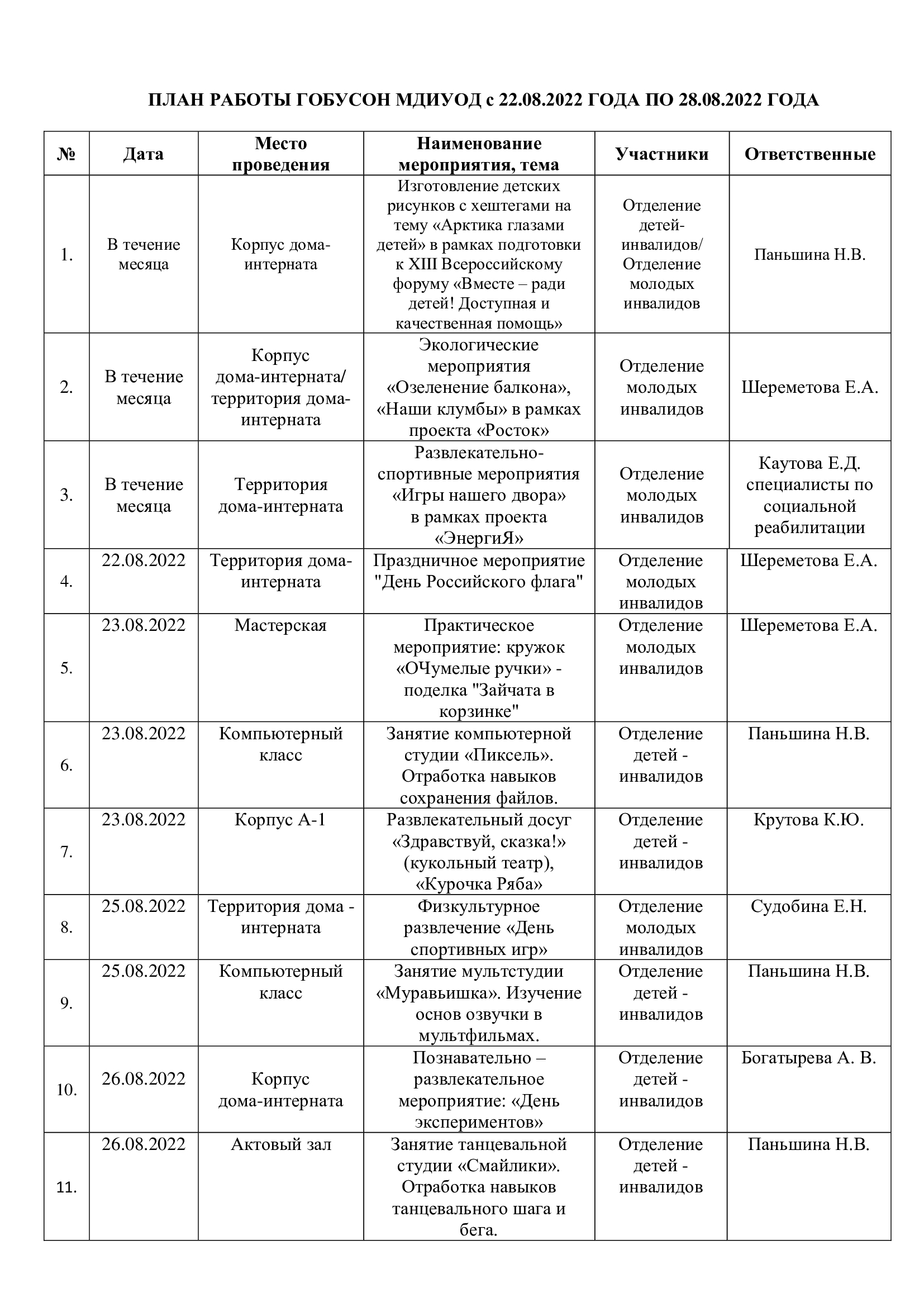План мероприятий ГОБУСОН МДИУОД с 22.08.2022 года по 28.08.2022 года