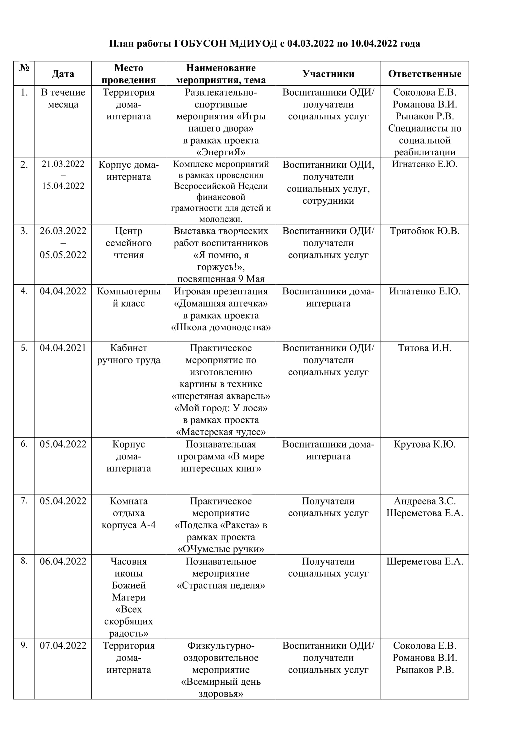 План работы ГОБУСОН МДИУОД с 04.04.2022 года по 08.04.2022 года
