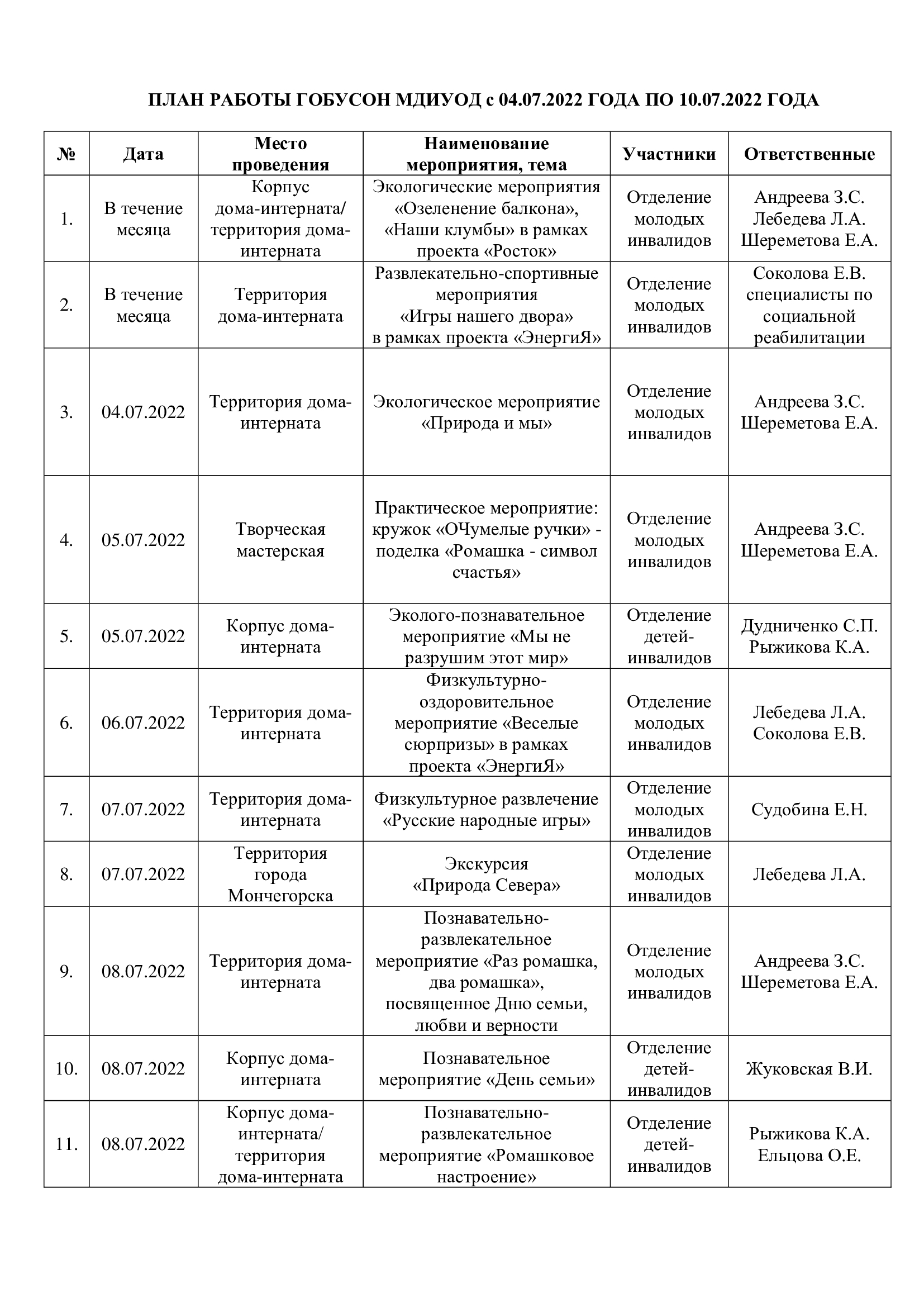 План работы ГОБУСОН МДИУОД с 04.07.2022 года по 10.07.2022 года