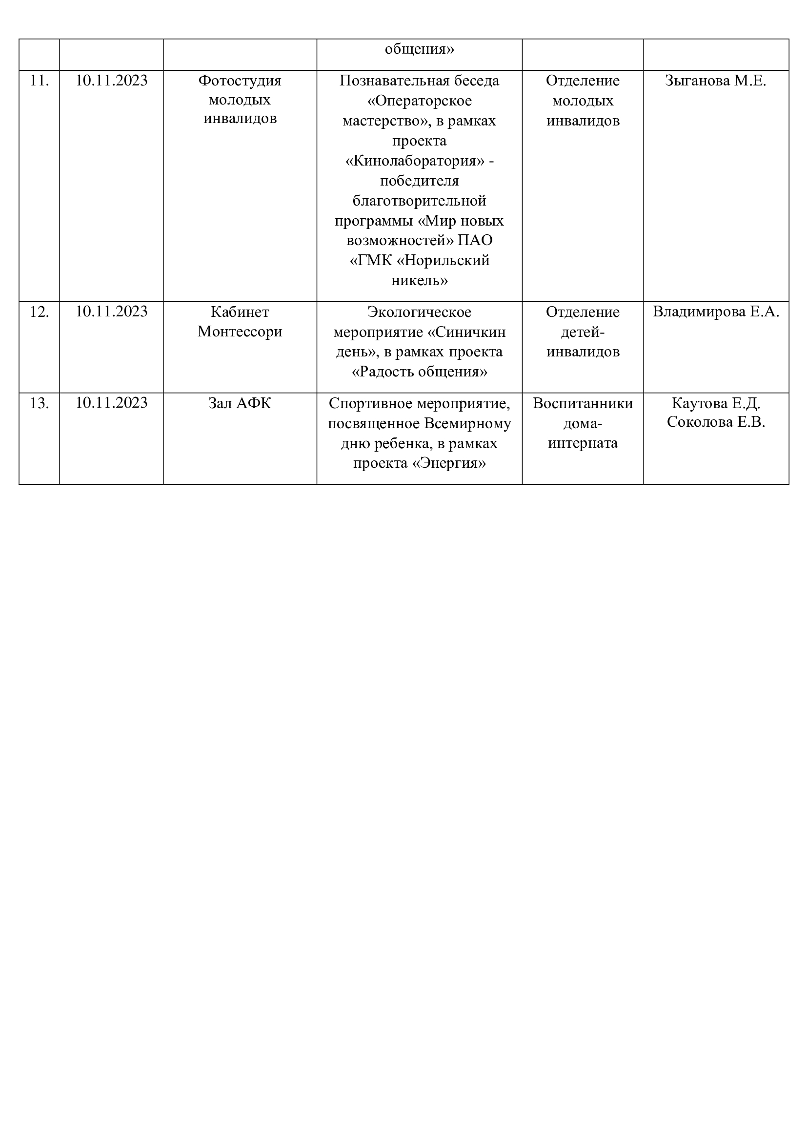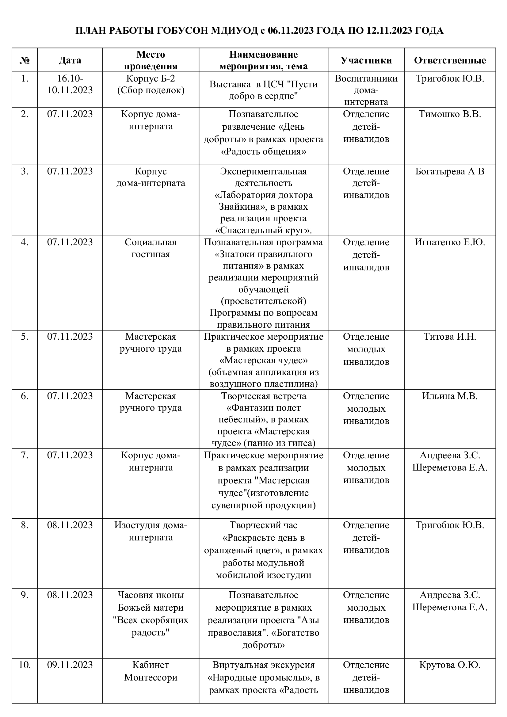 План работы ГОБУСОН МДИУОД с 06 ноября 2023 года по 12 ноября 2023 года
