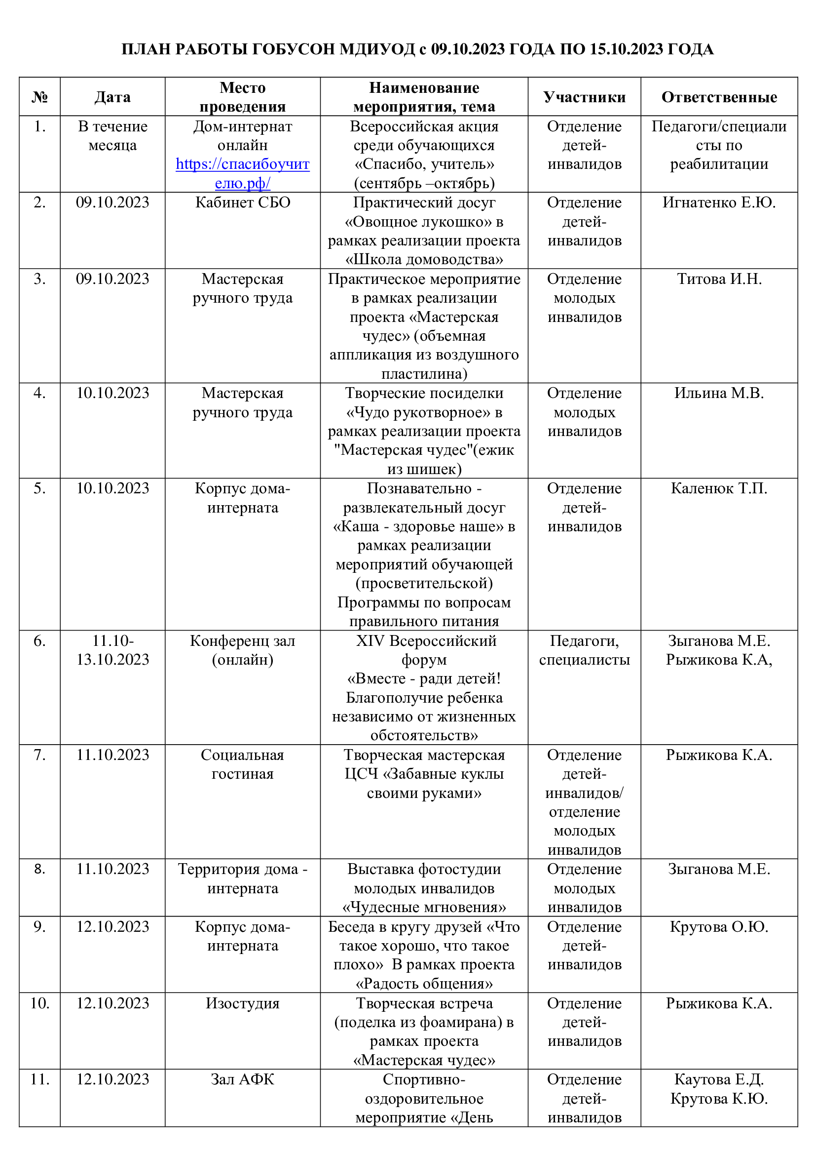 План работы ГОБУСОН МДИУОД с 09 октября по 15 октября 2023 года