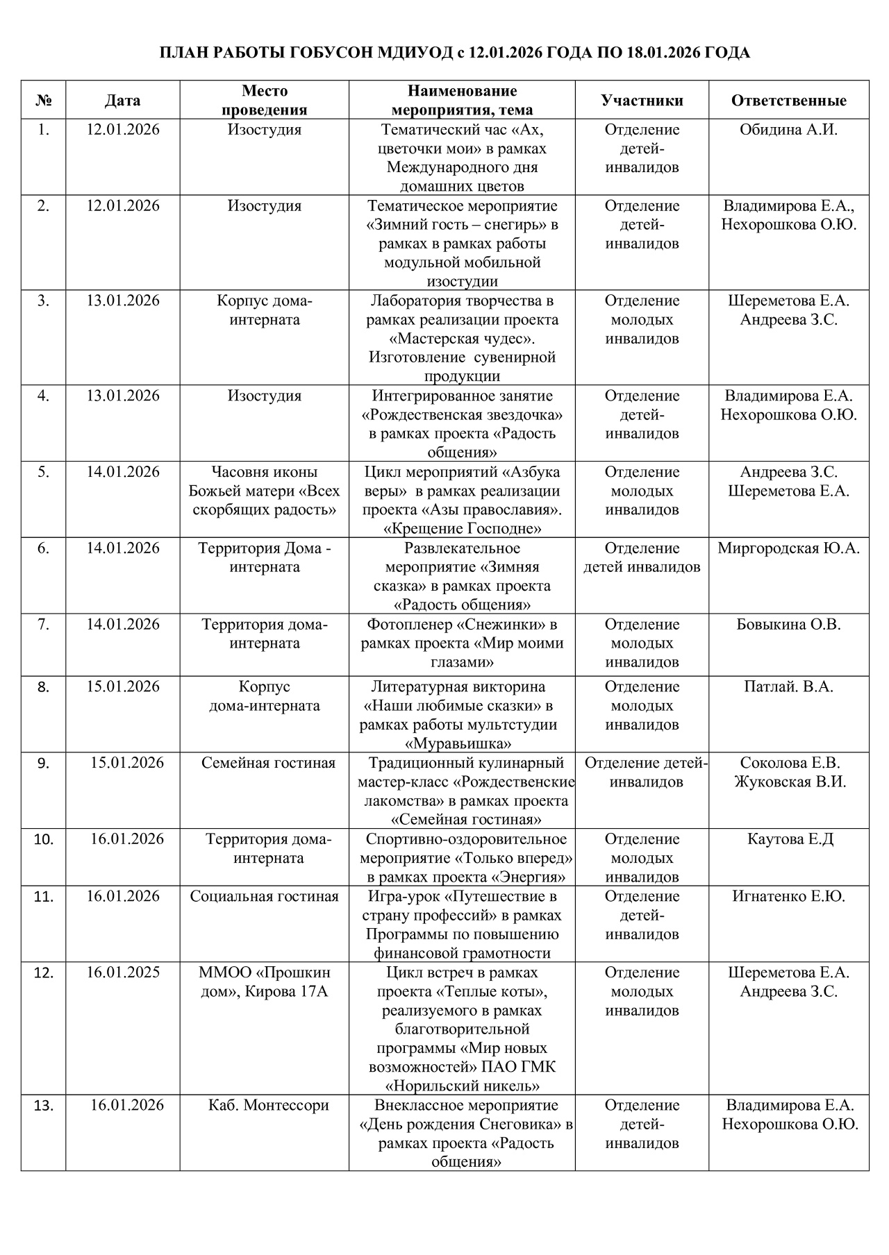 План работы ГОБУСОН МДИУОД с 12 января 2026 года по 18 января 2026 года