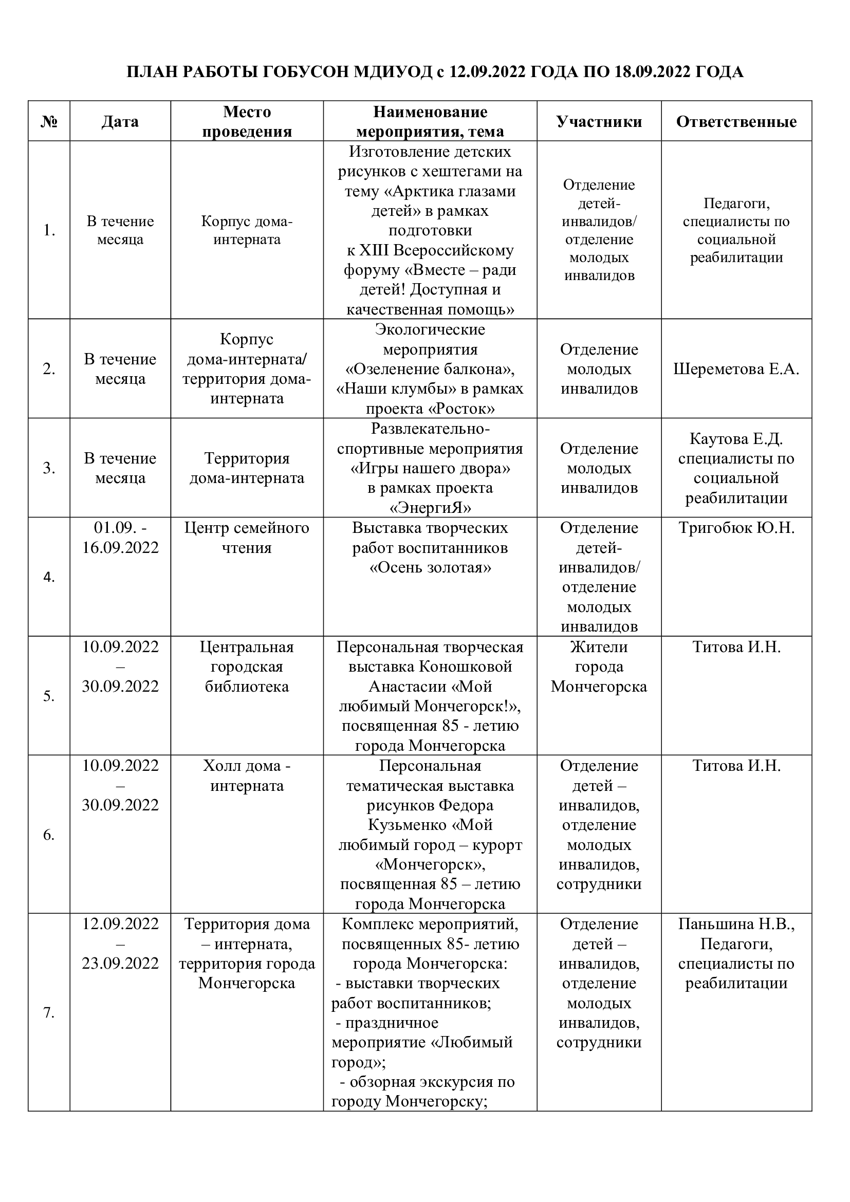 План работы ГОБУСОН МДИУОД с 12.09.2022 года по 18.09.2022 года
