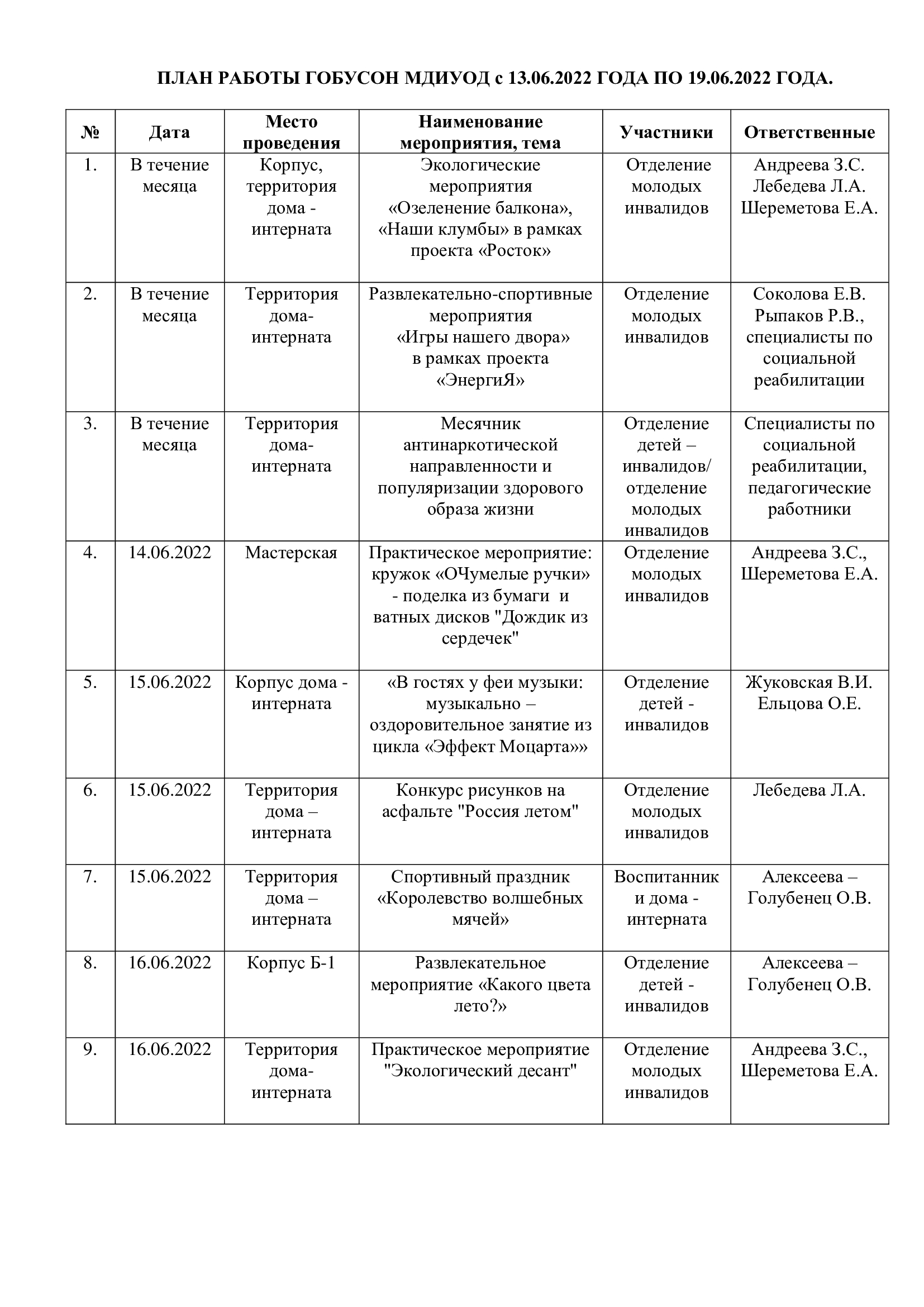 План работы ГОБУСОН МДИУОД с 13.06.2022 года по 19.06.2022 года