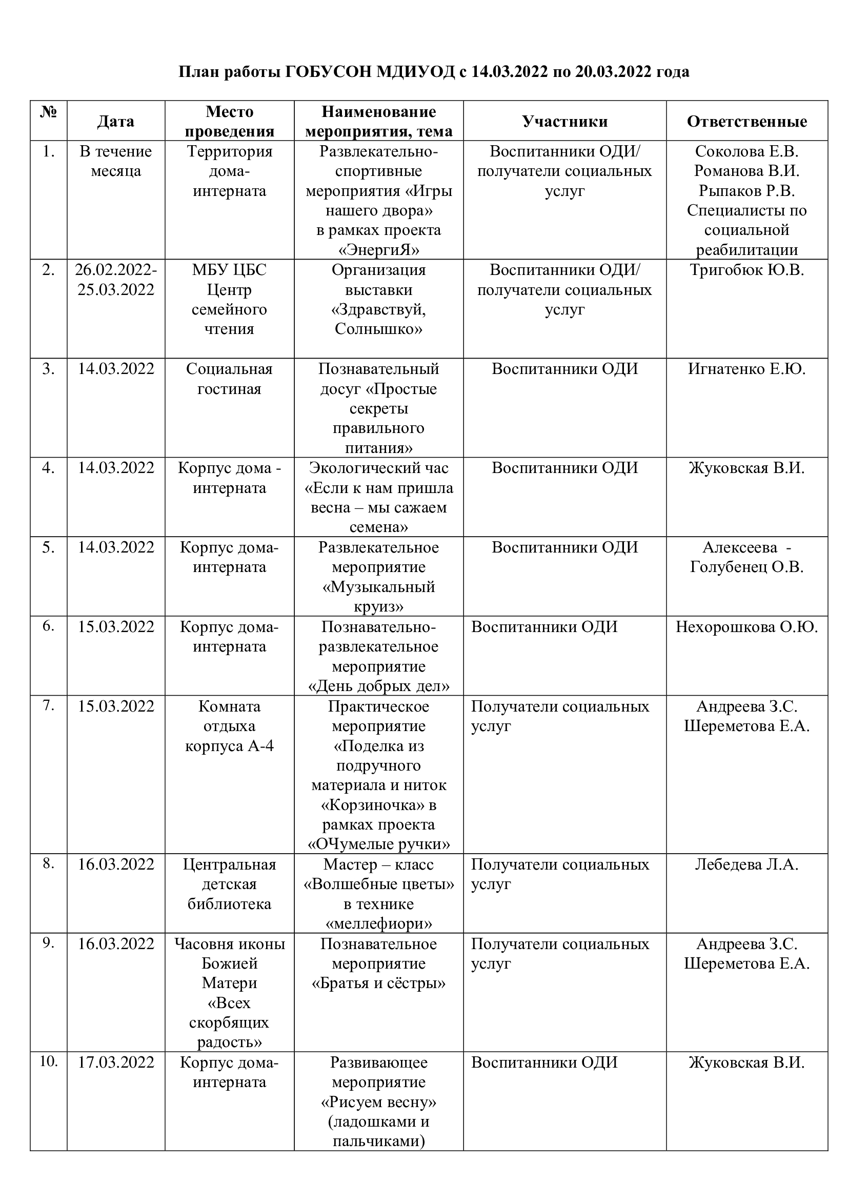 План работы ГОБУСОН МДИУОД с 14.03.2022 по 20.03.2022 года