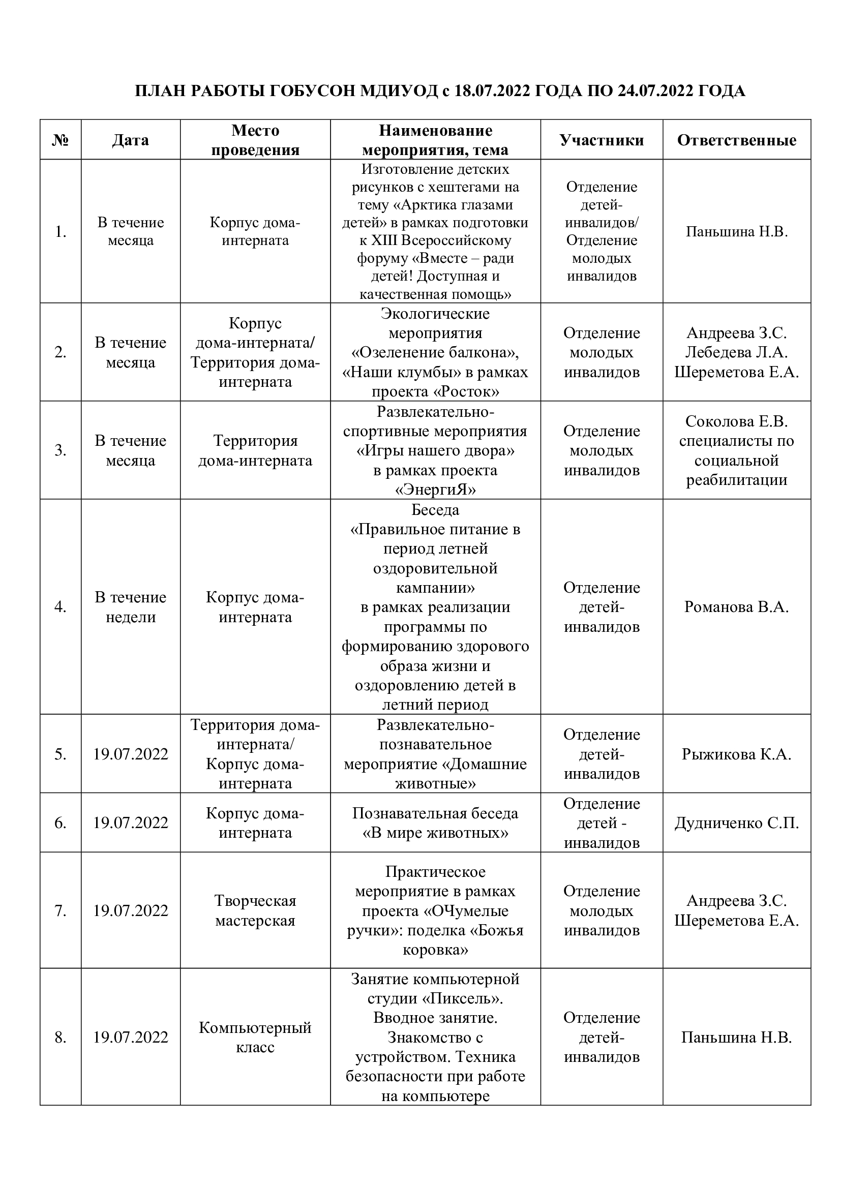 План работы ГОБУСОН МДИУОД с 18.07.2022 по 24.07.2022