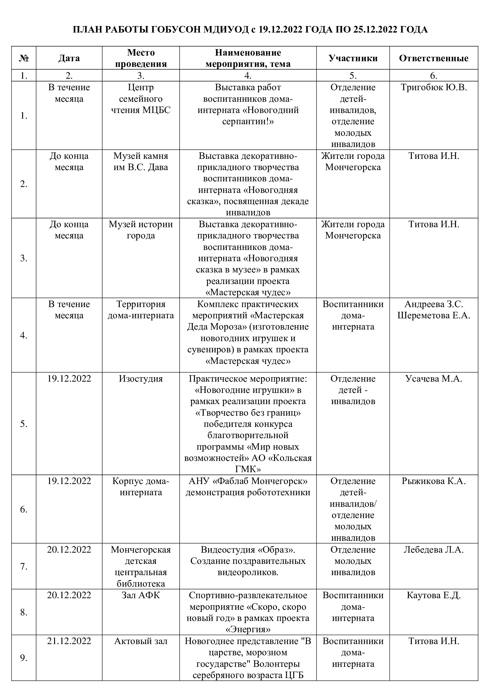 План работы ГОБУСОН МДИУОД с 19.12.2022 года по 25.12.2022 года.