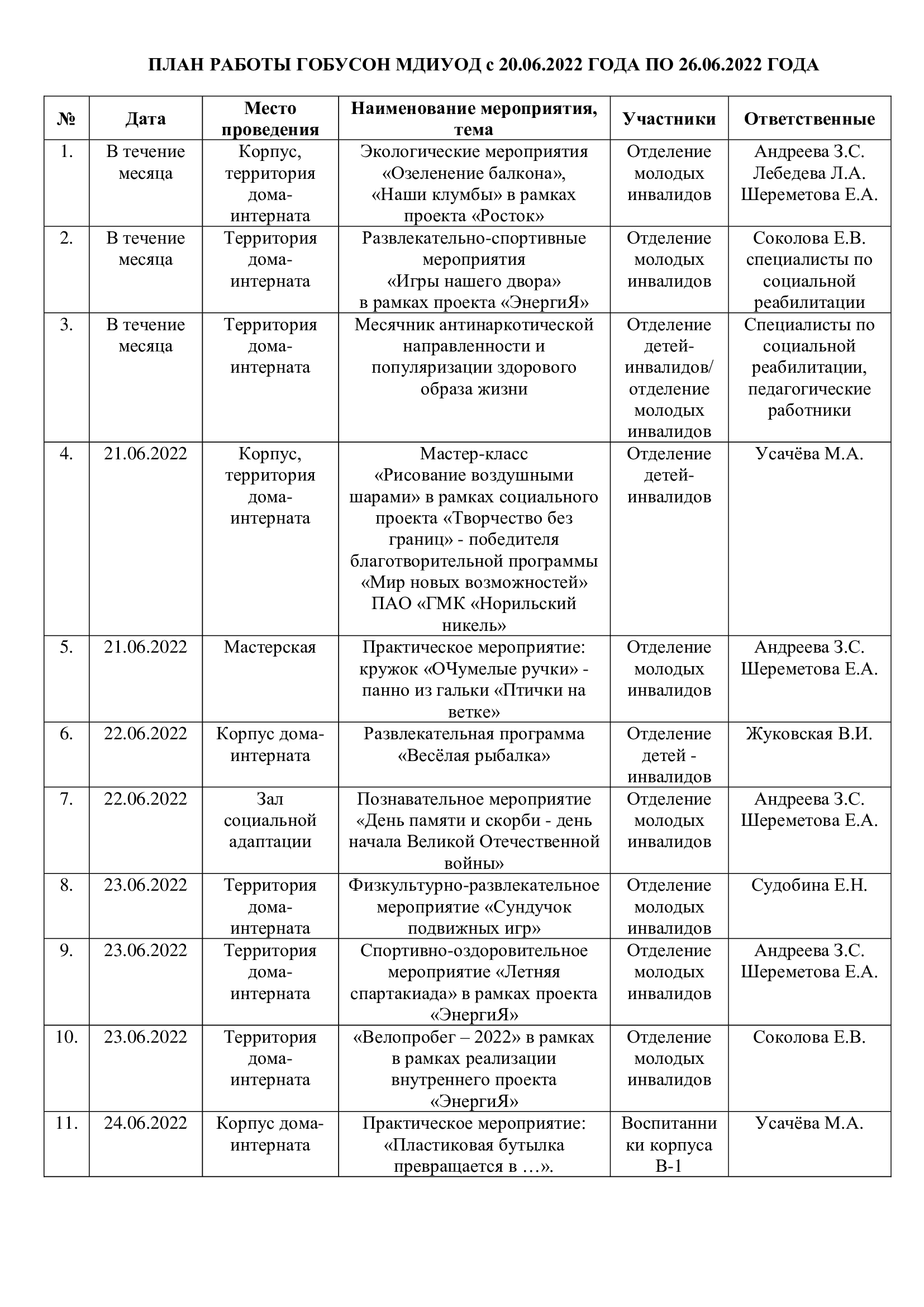 План работы ГОБУСОН МДИУОД с 20.06.2022 года по 26.06.2022 года