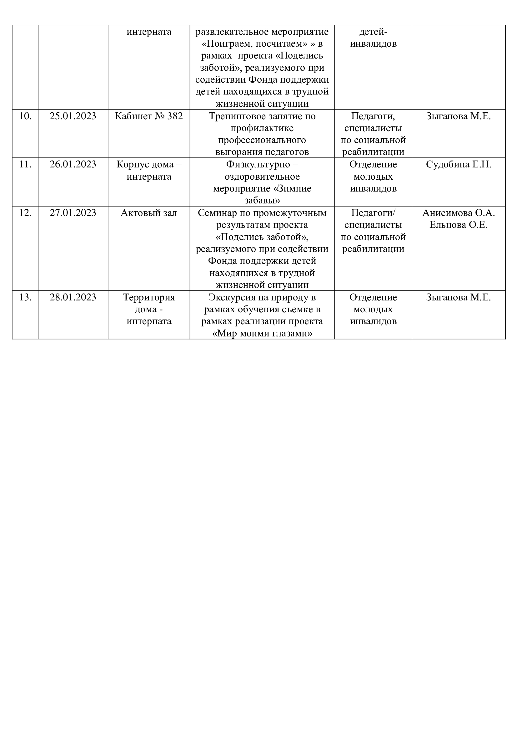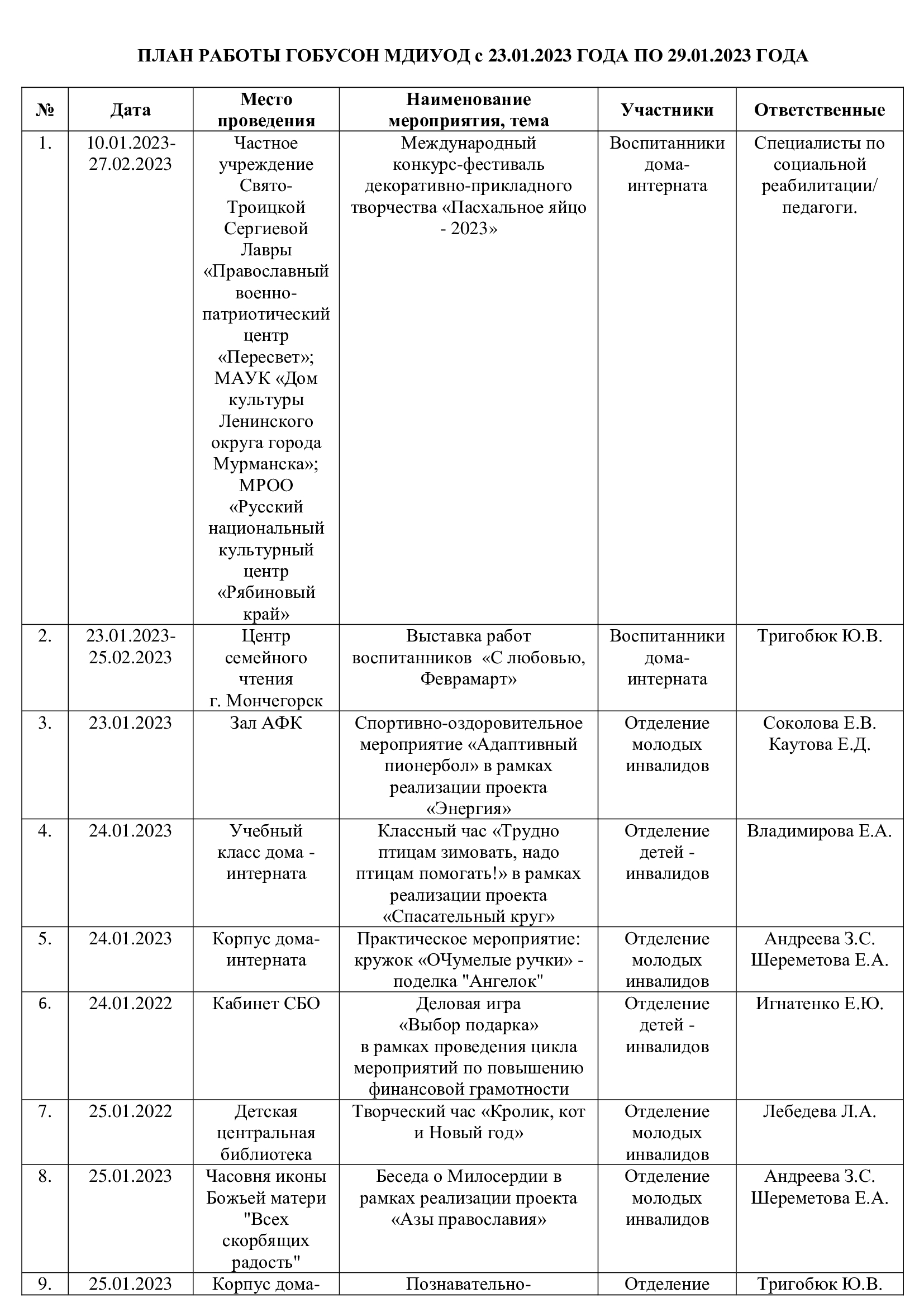 План работы ГОБУСОН МДИУОД с 23 января 2023 года по 29 января 2023 года