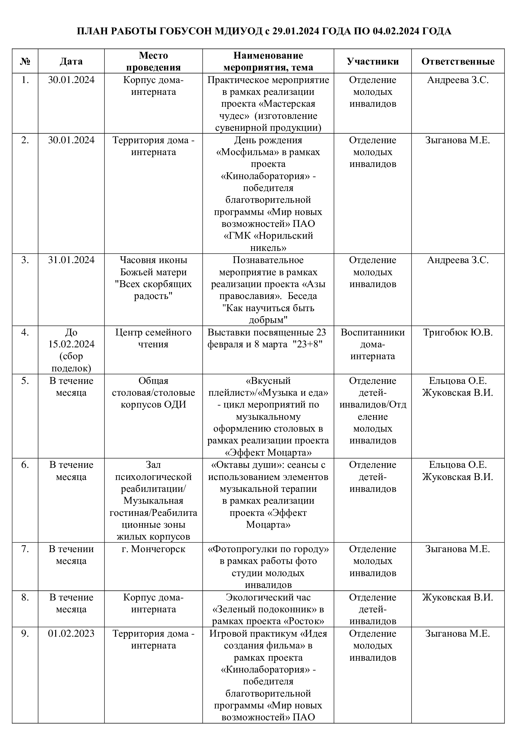 План работы ГОБУСОН МДИУОД с 29 января по 04 февраля 2024 года