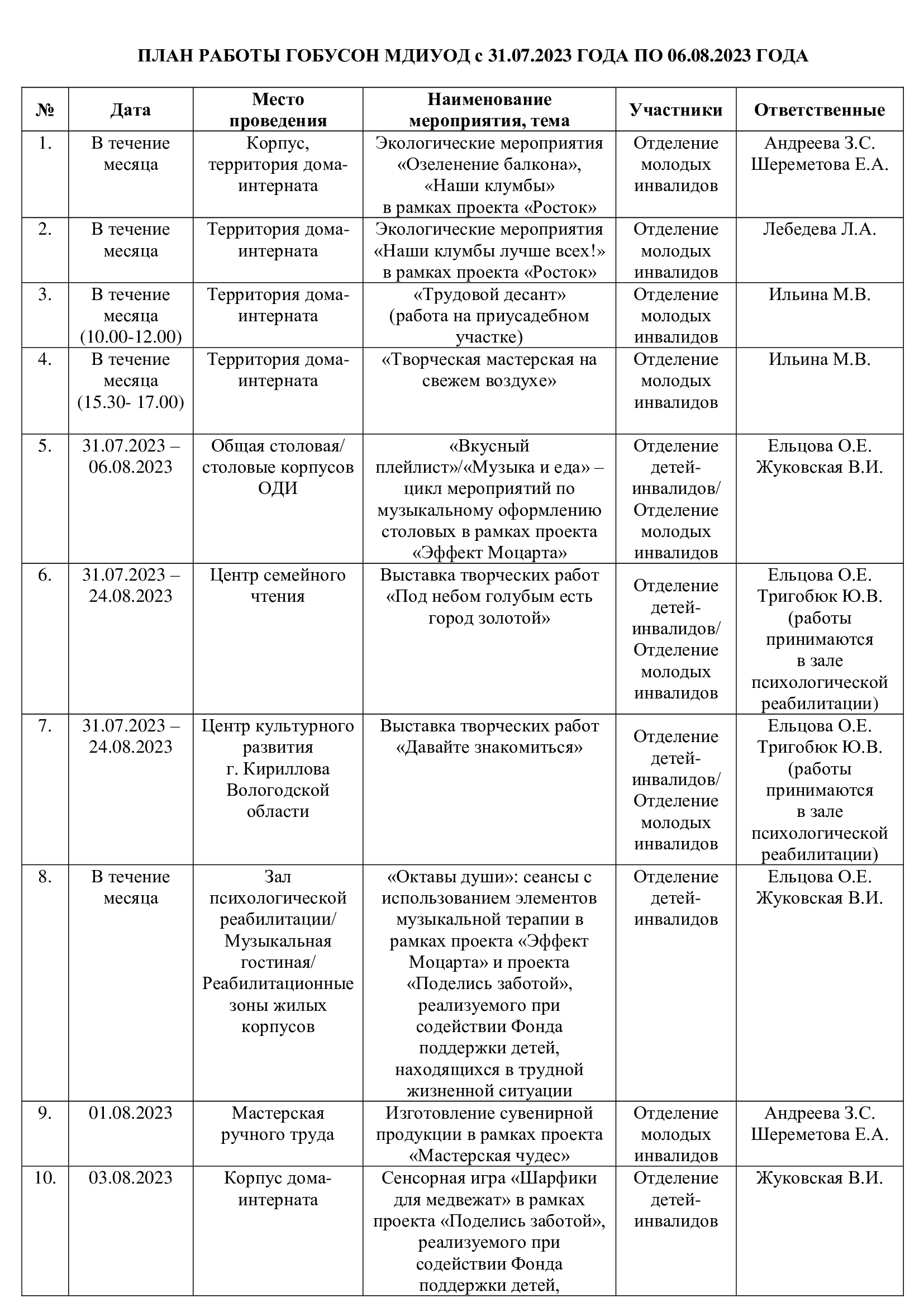 План работы ГОБУСОН МДИУОД с 31.07.2023 по 06.08.2023