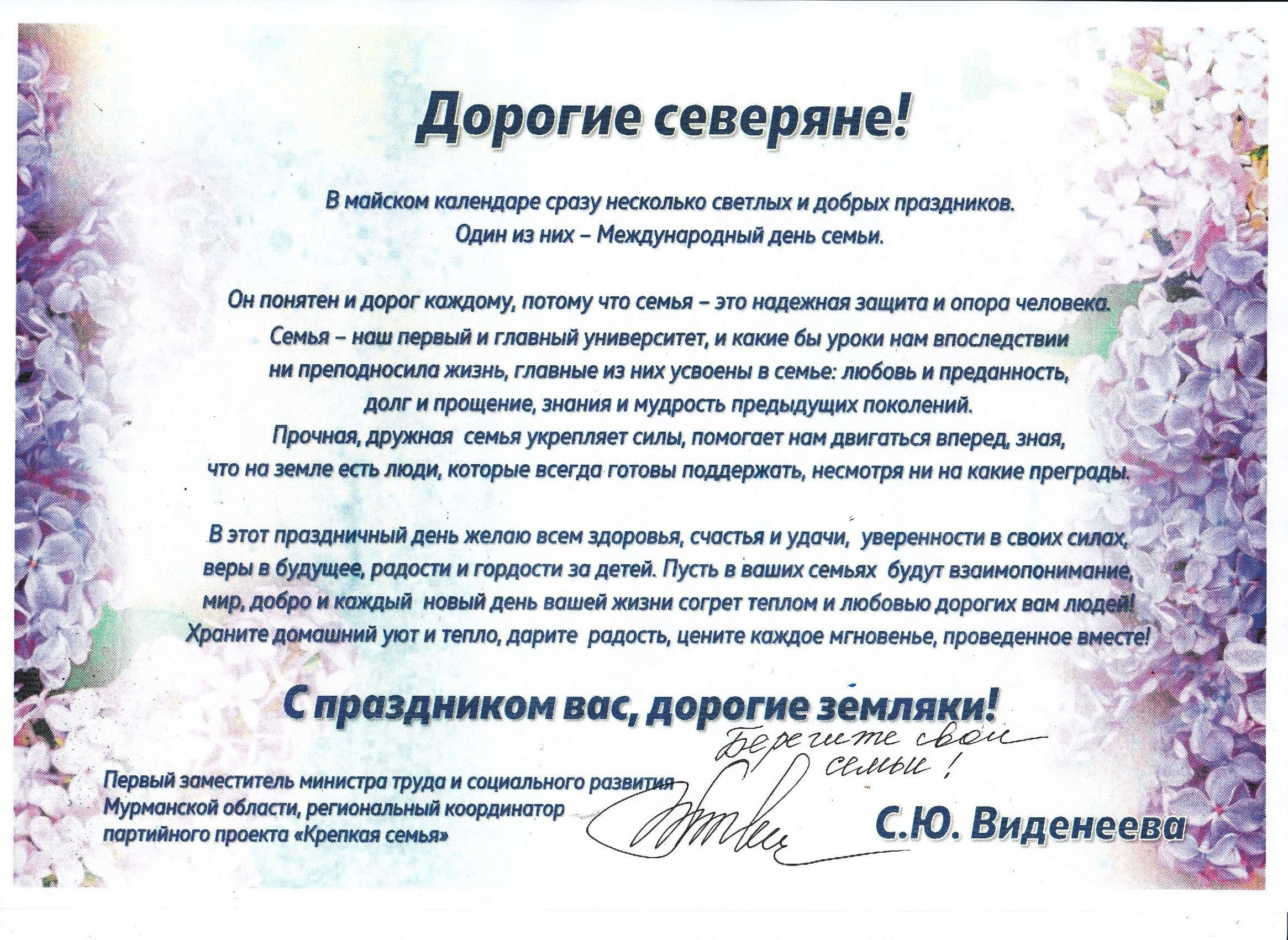 Поздравление Министерства труда и социального развития Мурманской области с Международным днем семьи