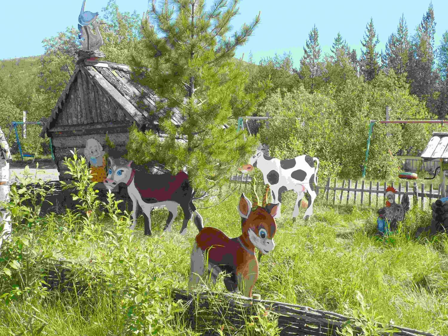 На участках появились новые оригинальные украшения: около «деревенского домика» пасутся коровы и козы, а на забор взгромоздился пестрый петух.