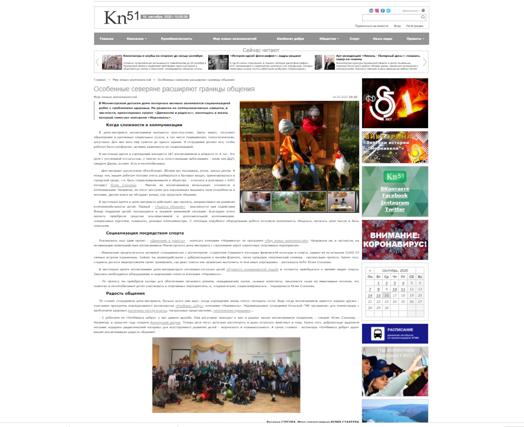 Журналисты интернет-издания Kn51.ru в статье осветили проблему социализации воспитанников дома-интерната, их взаимодействие с волонтерами и активное участие в проектах и мероприятиях различного уровня.