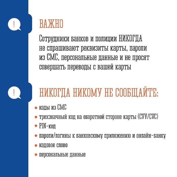 Помните: сотрудники банков и полиции никогда не спрашивают реквизиты карт и не просят совершать какие-либо манипуляции с переводом денег.