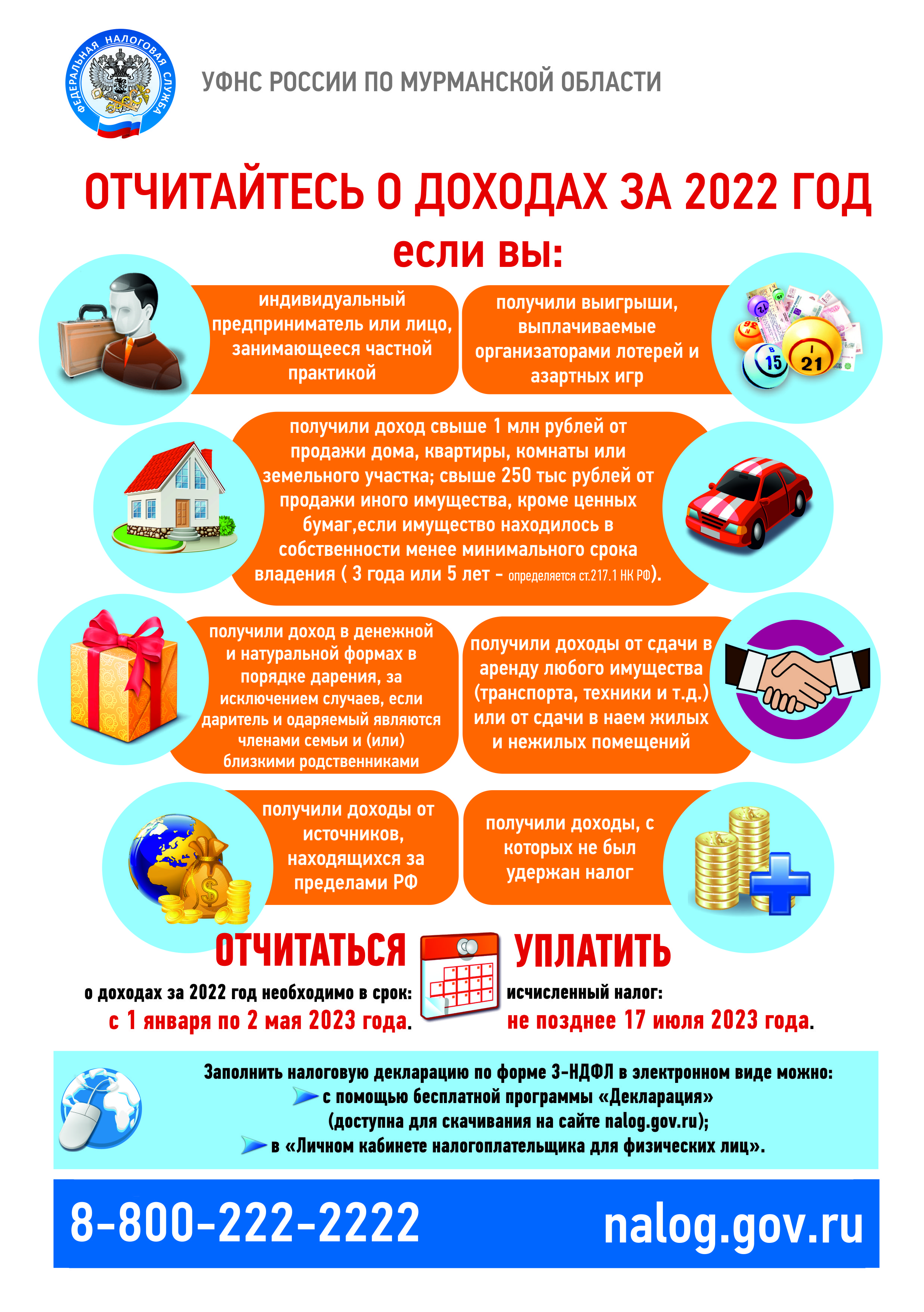 С 01.01.2023 проводится декларационная кампания 2023 года, в ходе которой необходимо отчитаться о полученных в 2022 году доходах, представив в налоговый орган налоговую декларацию по налогу на доходы физических лиц (форма 3-НДФЛ) лично, через представителя, почтовым отправлением, через личный кабинет налогоплательщика или МФЦ, не позднее 2 мая 2023 года физическим лицам: