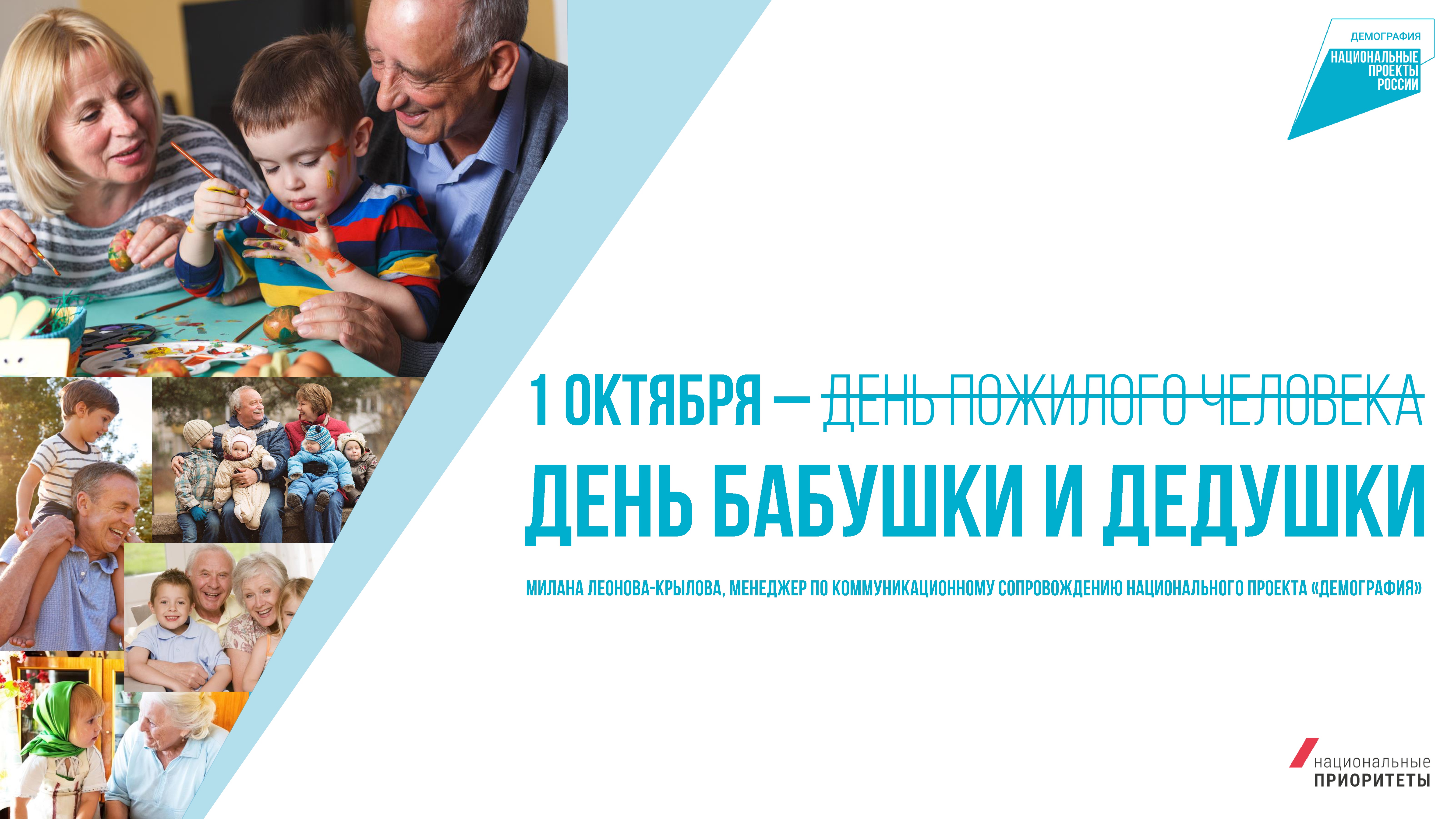 Ежегодно 1 октября в России отмечают День пожилого человека. Но он не звучит как праздник с которым хочется поздравлять, и тем более - получать поздравления. Предлагаем в коммуникациях переименовать День пожилого человека в День бабушек и дедушек и тем самым вписать его в один ряд с Днем матери и Днем отца.