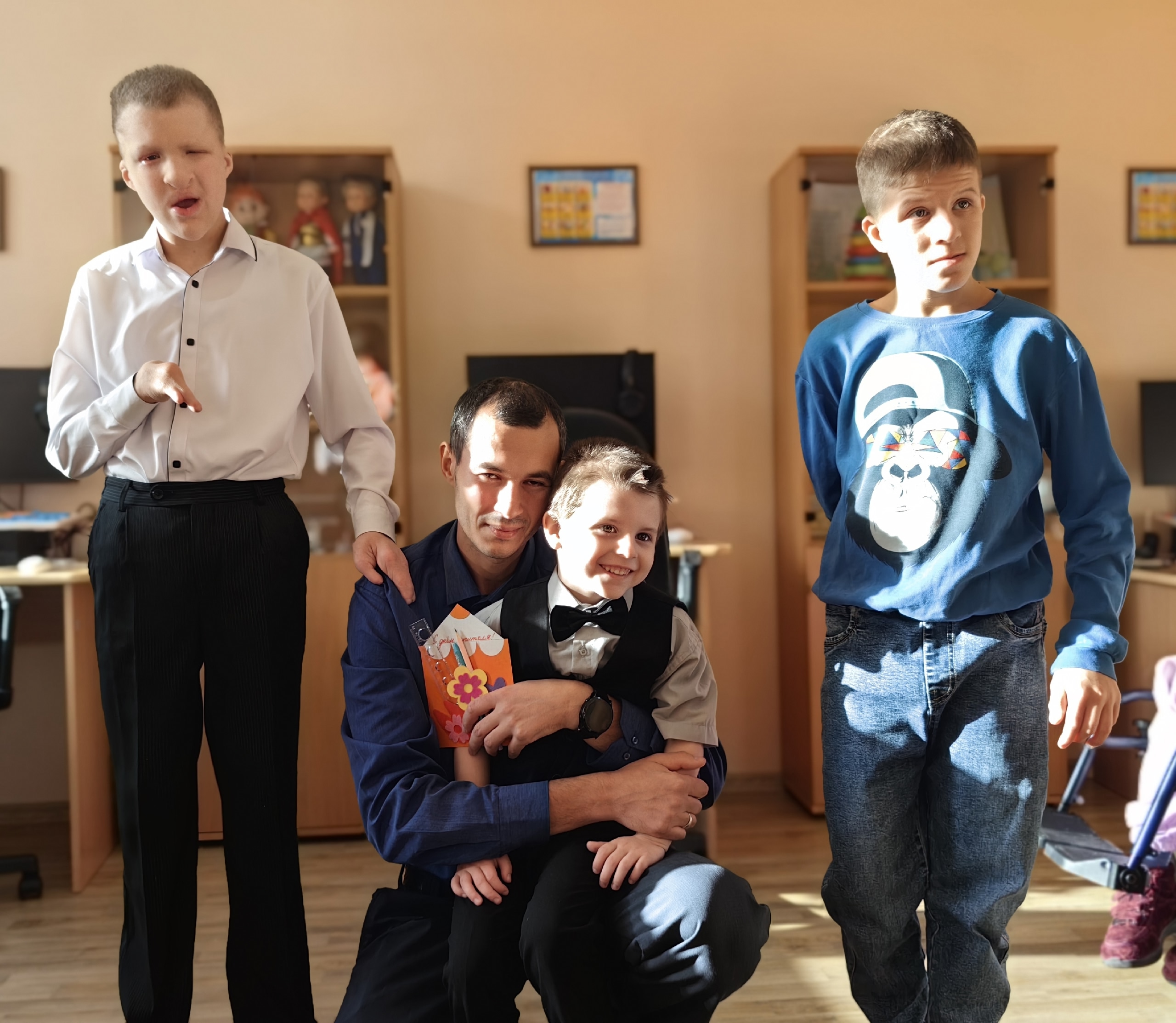 | Мужчина и трое детей стоят рядом | Учителю – дефектологу дарят открытку | Женщина и двое детей стоят рядом | Женщина держит открытку, ребенок стоит рядом |