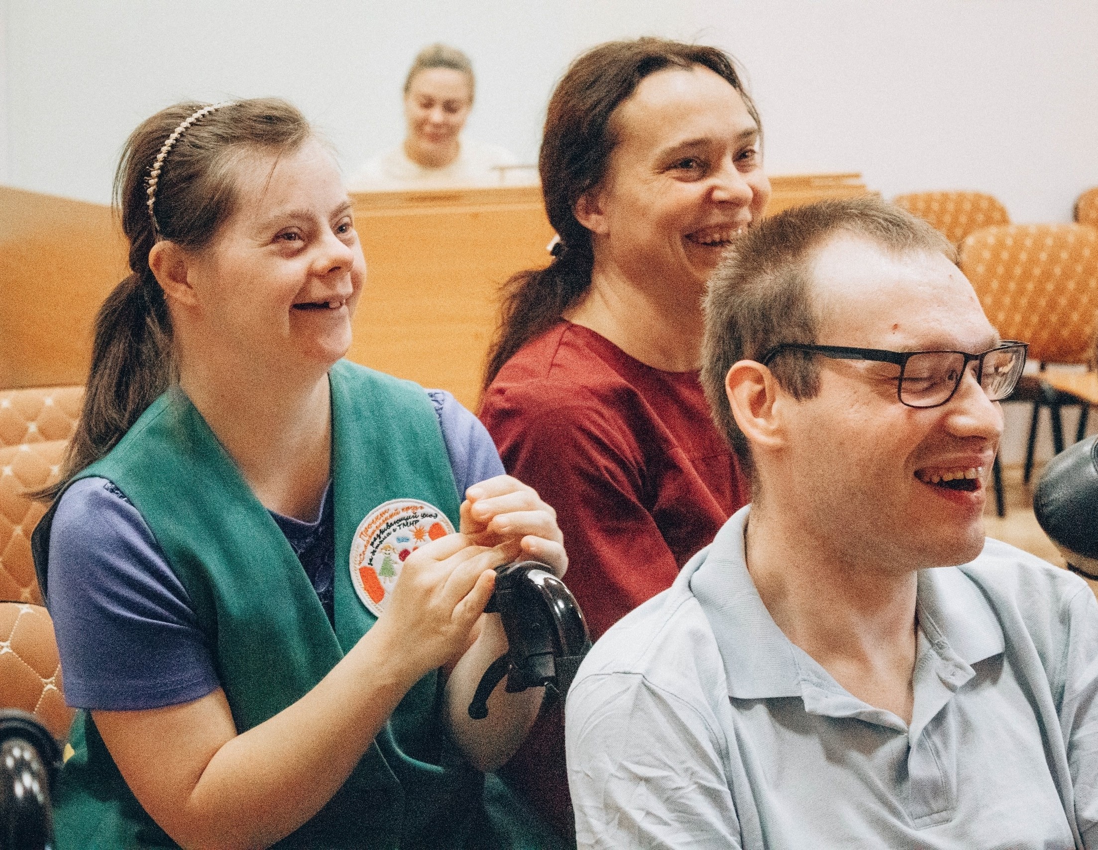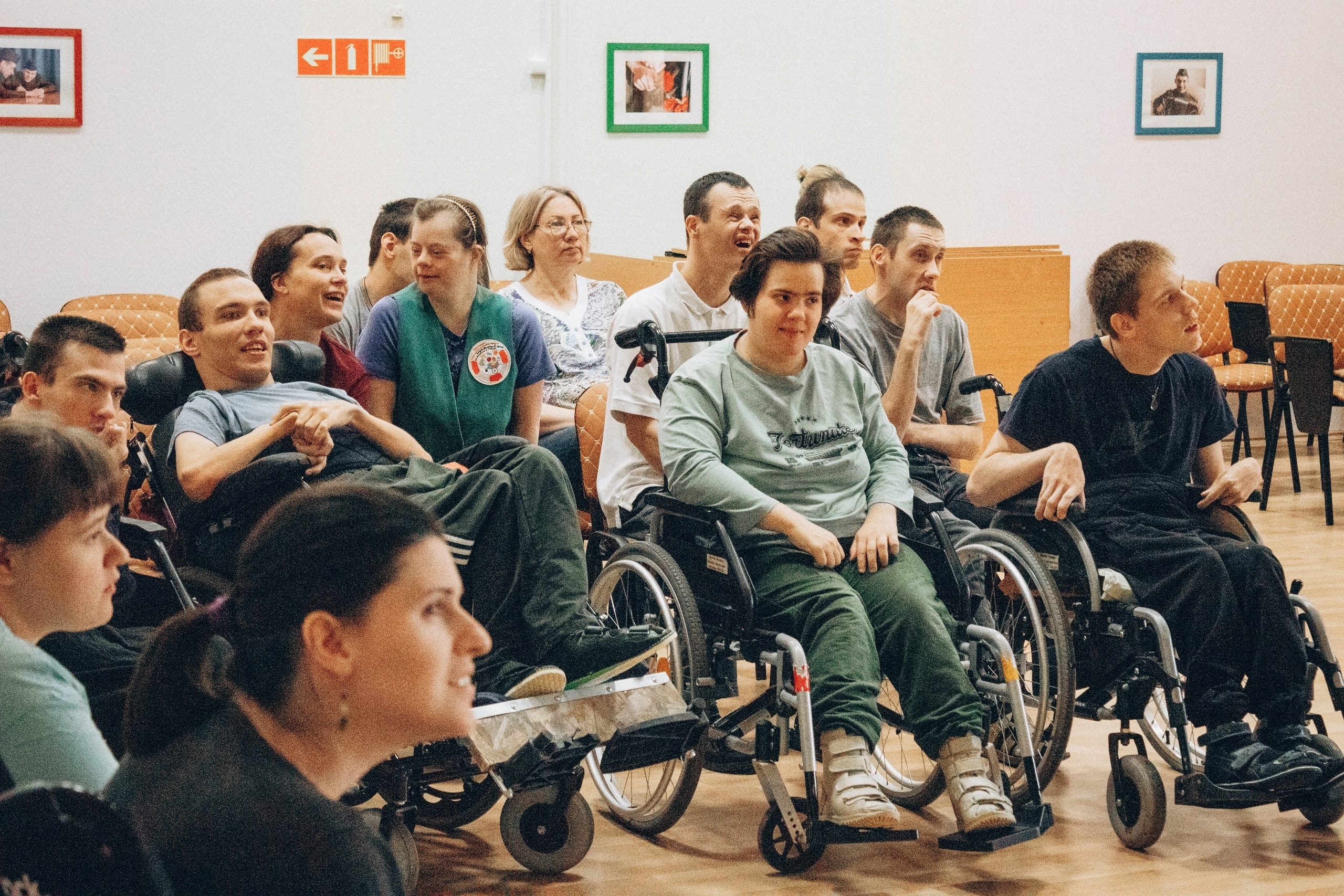 | Воспитанники сидят и общаются друг с другом | Воспитанница выполняет творческое задание | Молодые люди смеются |