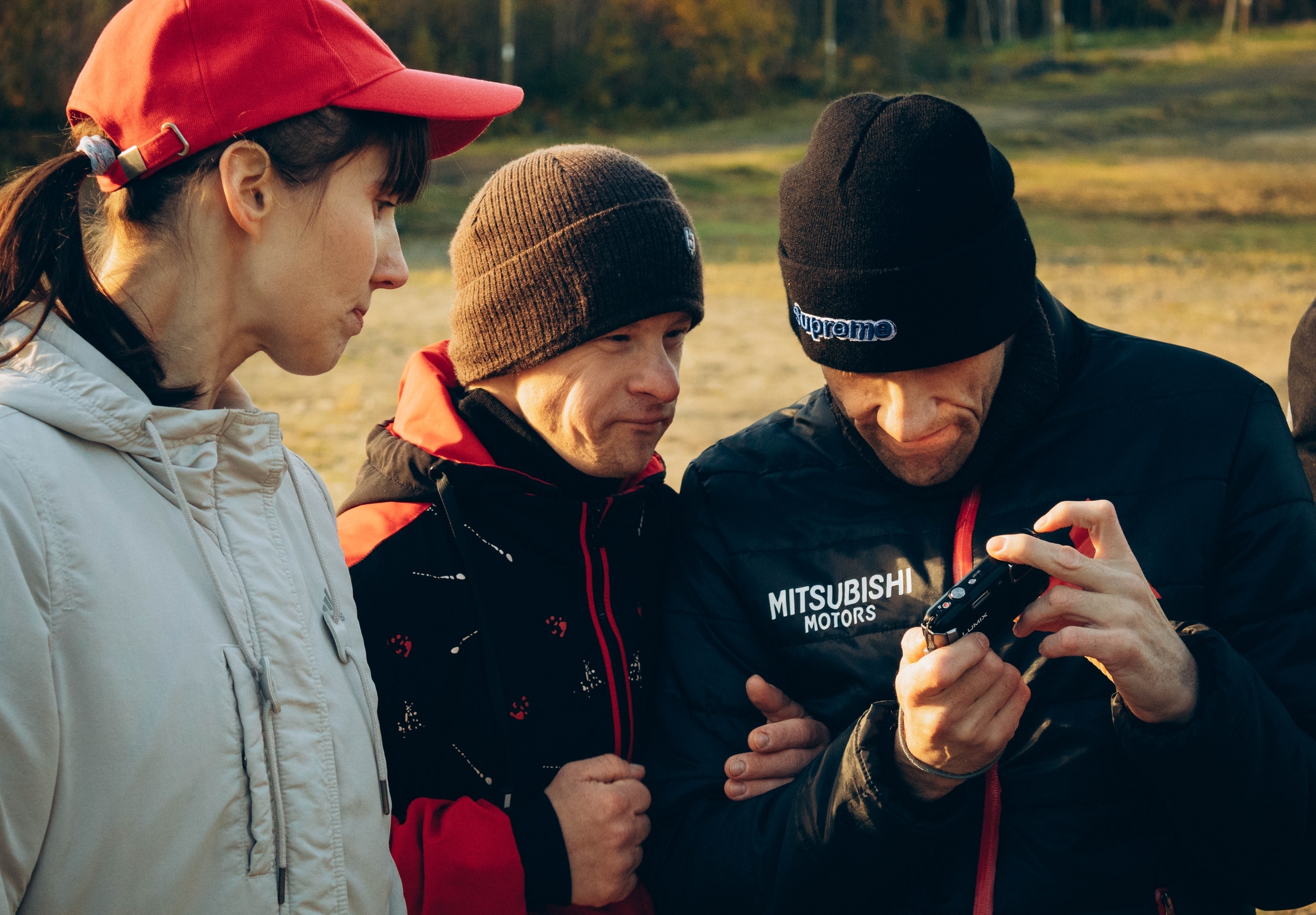 | Люди стоят на фоне осеннего леса. | Двое мужчин и девушка рассматривают фотографии | Мужчина учит девушку пользоваться фотоаппаратом |