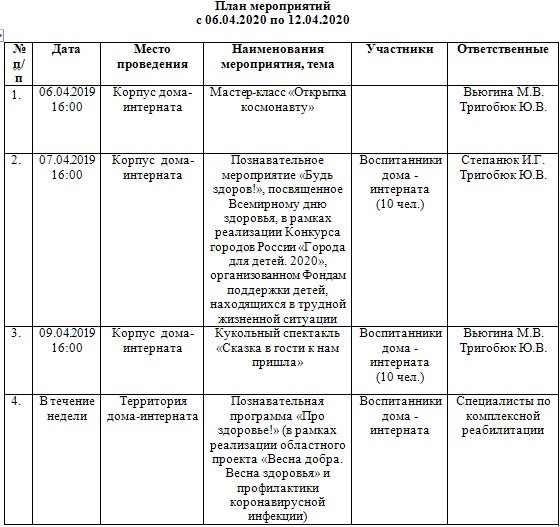 План мероприятий с 06.04.2020 по 12.04.2020