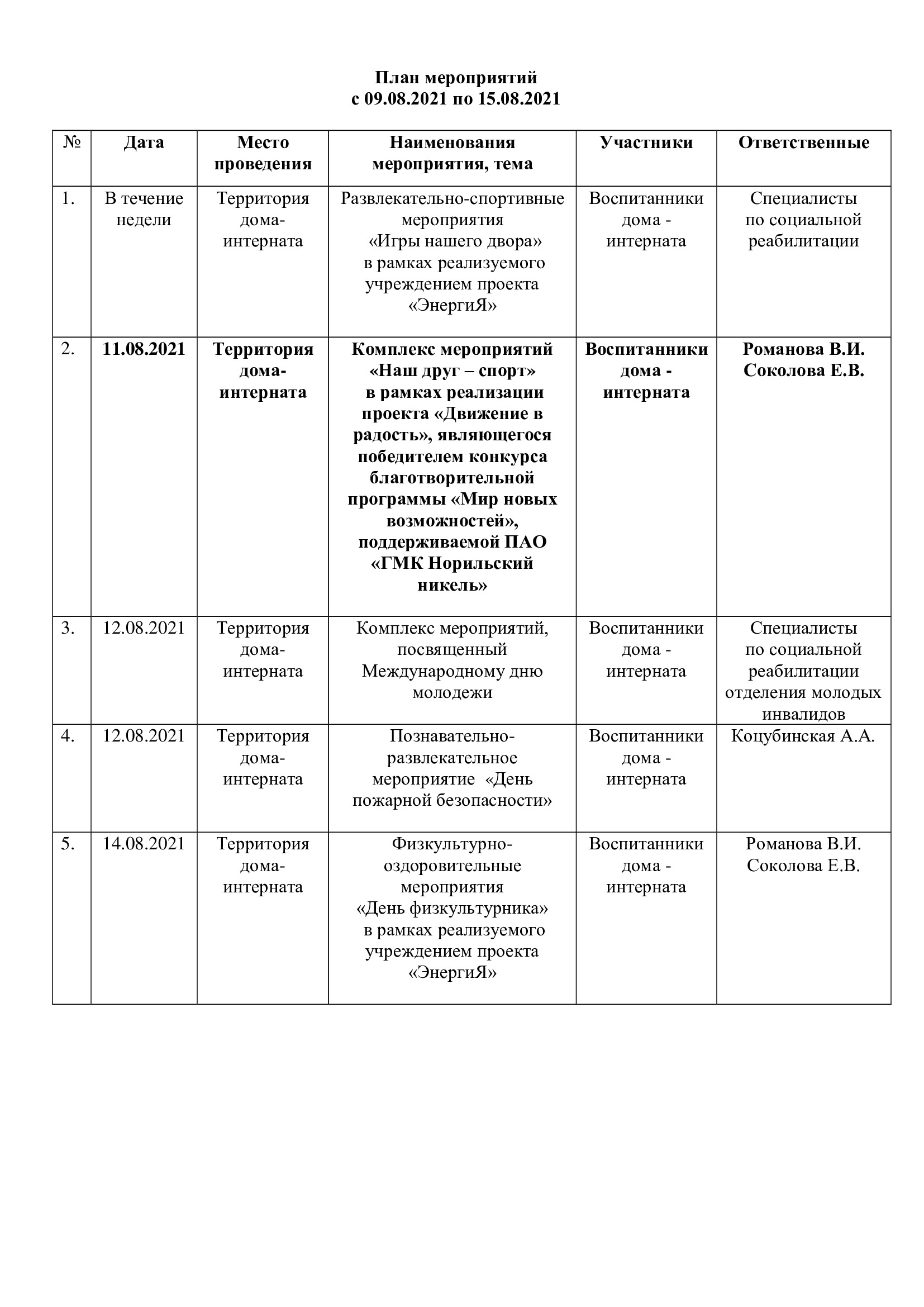 План мероприятий с 09.08.2021 по 15.08.2021