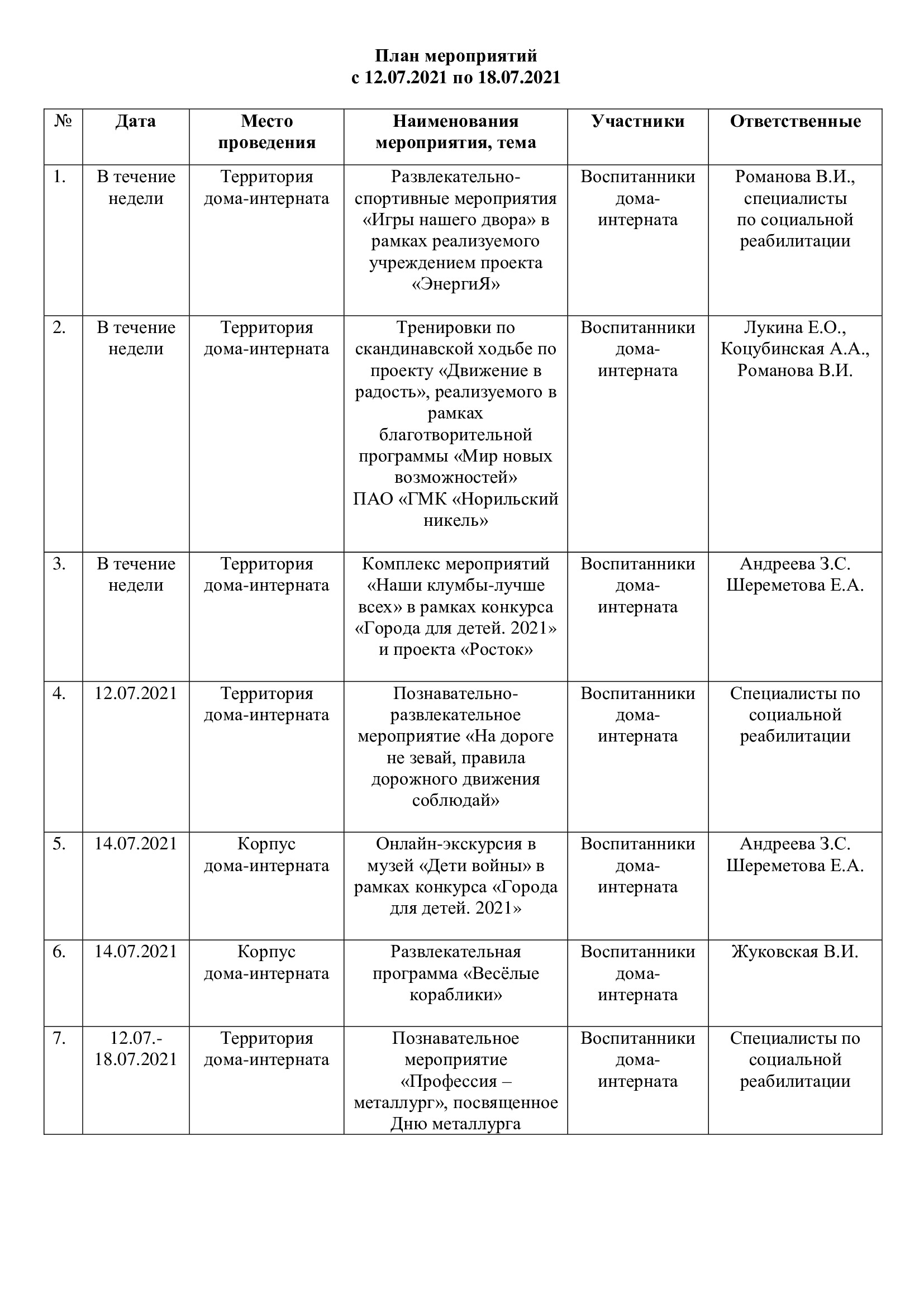 План мероприятий с 12.07.2021 по 18.07.2021