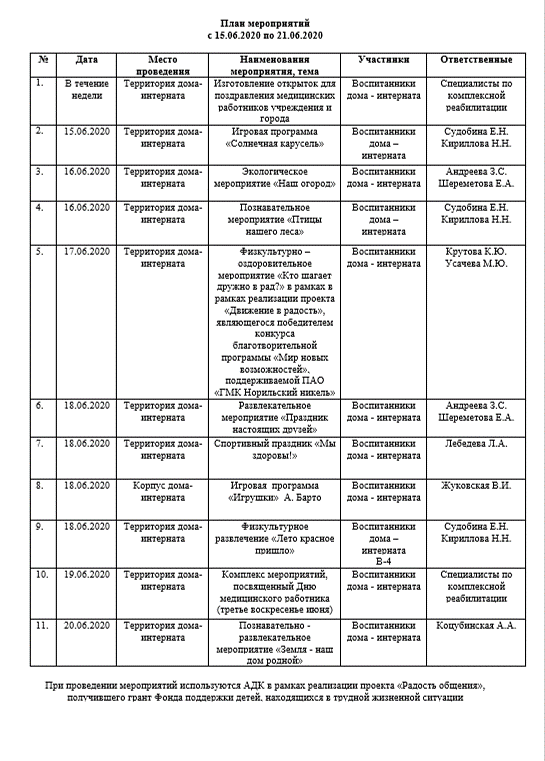 План мероприятий с 15.06.2020 по 21.06.2020