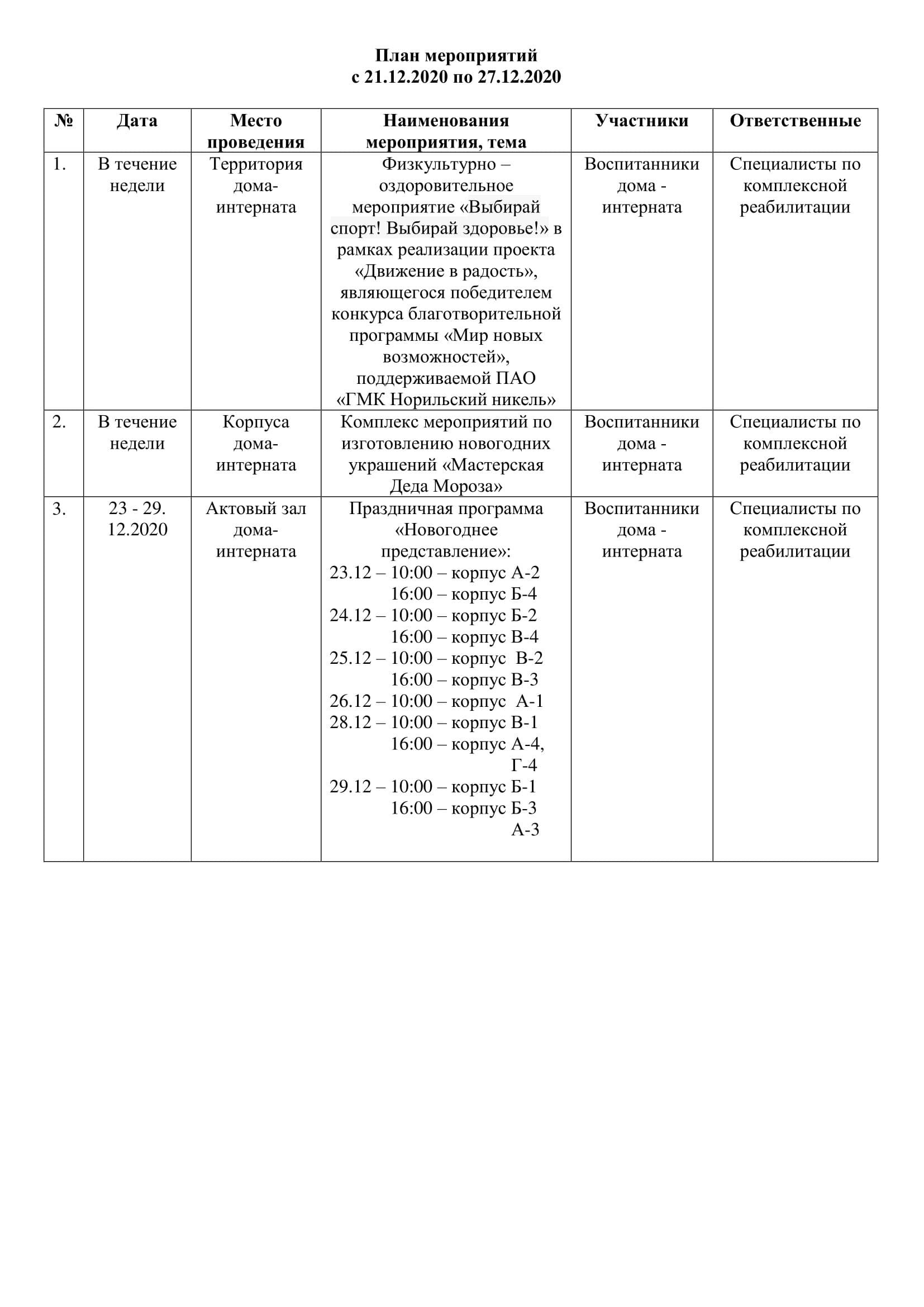 План мероприятий с 21.12.2020 по 27.12.2020