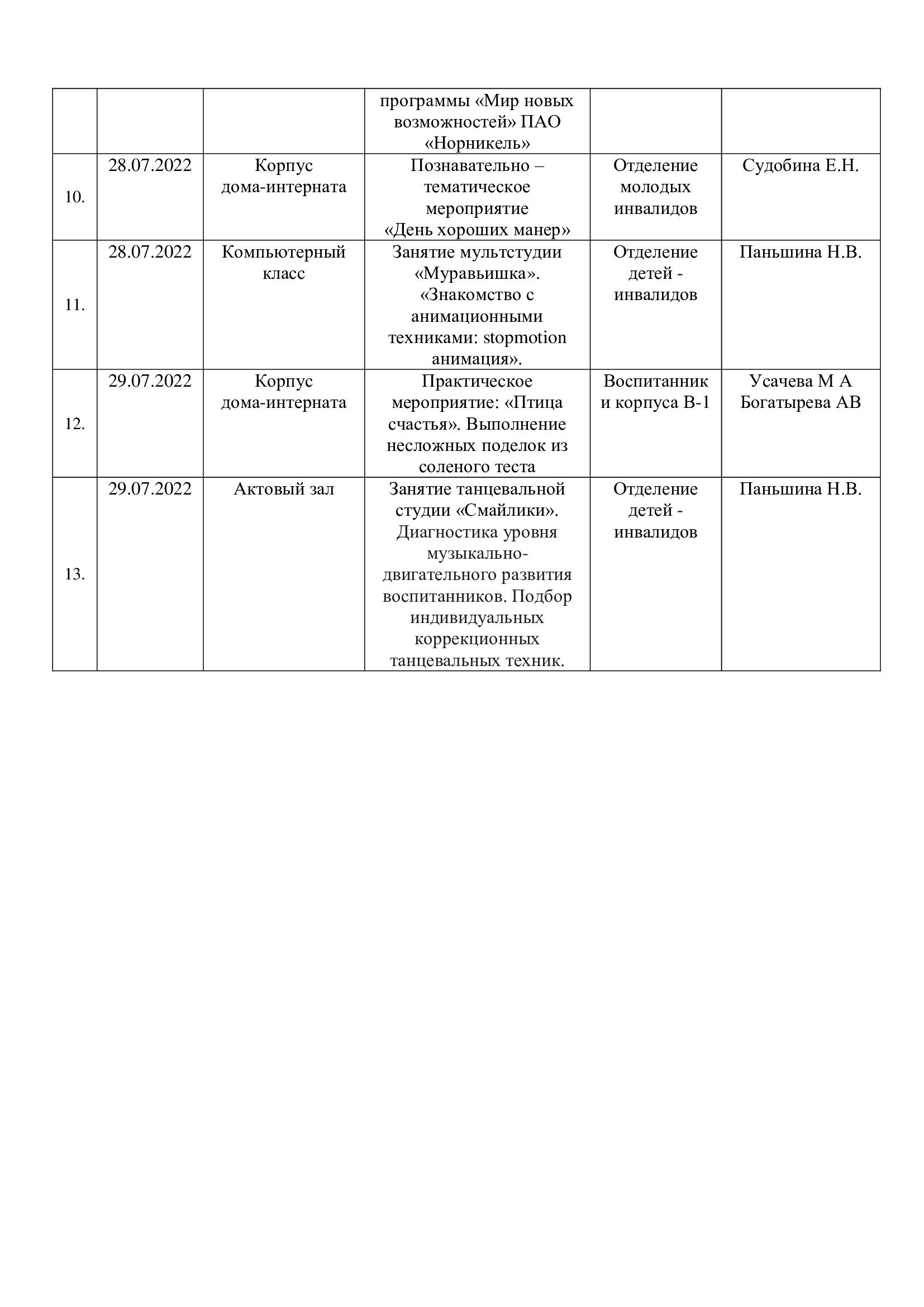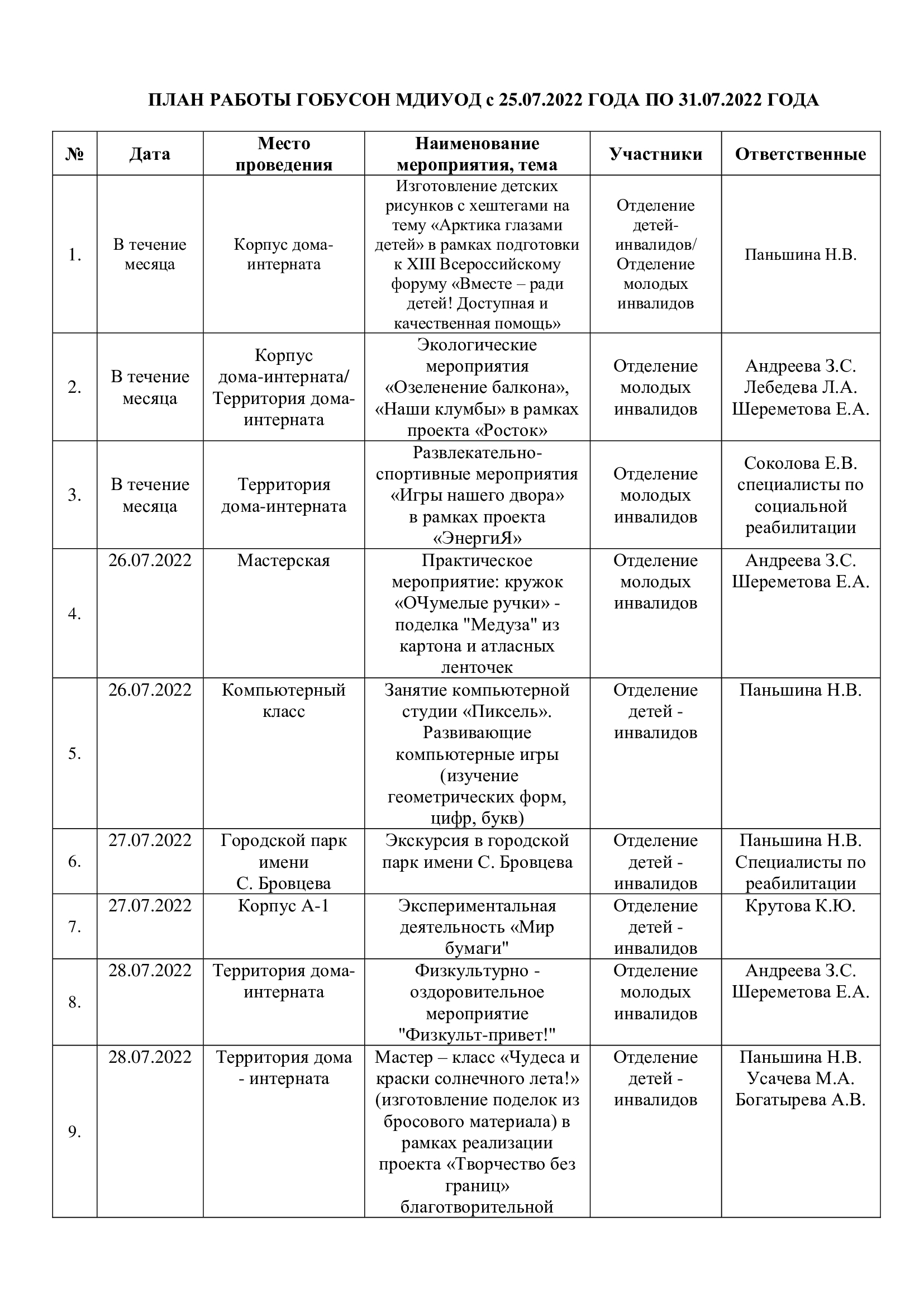 План мероприятий с 25.07.2022 года по 31.07.2022 года