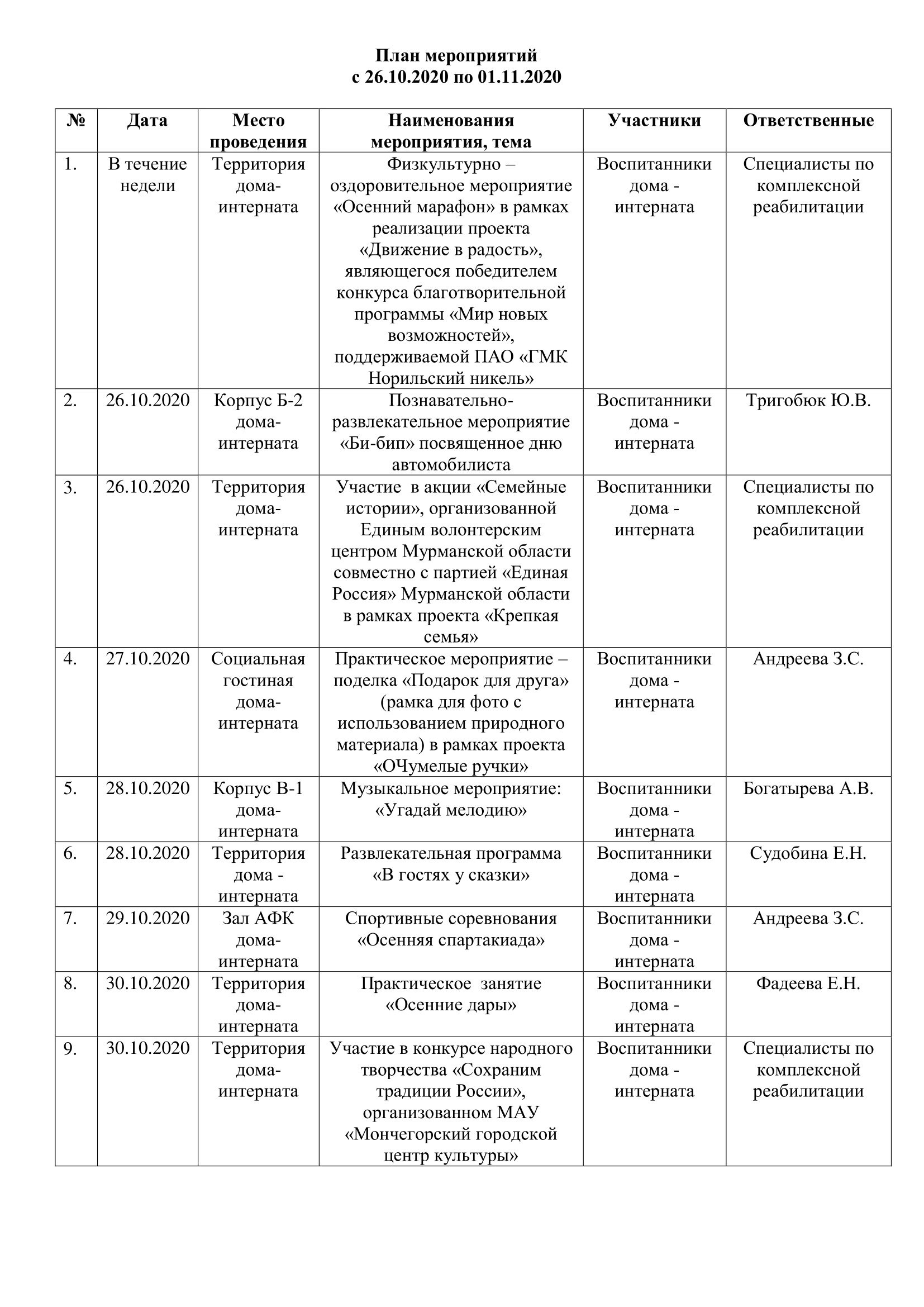 План мероприятий с 26.10.2020 по 01.11.2020