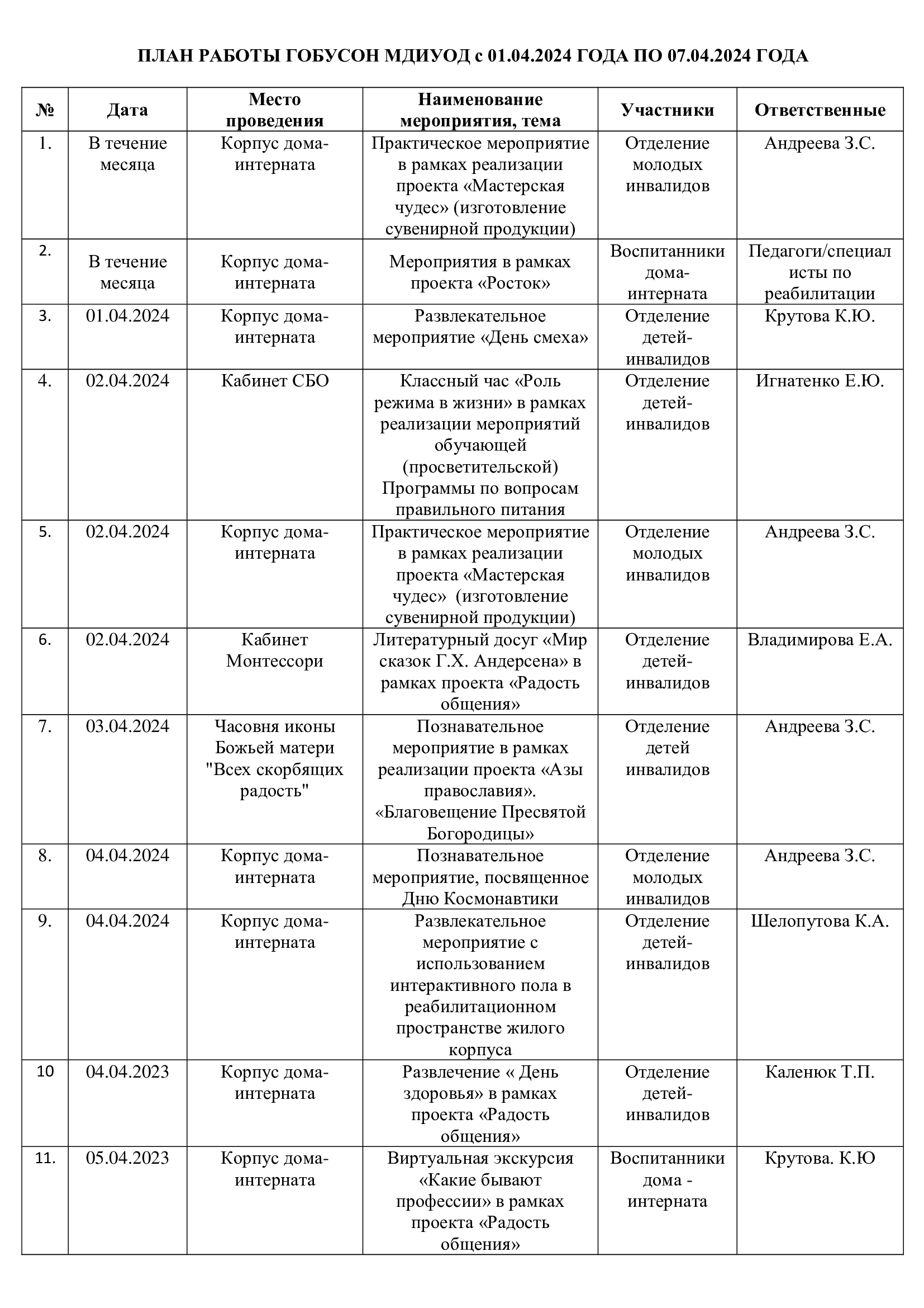 План работы ГОБУСОН МДИУОД с 01 апреля по 07 апреля 2024 года