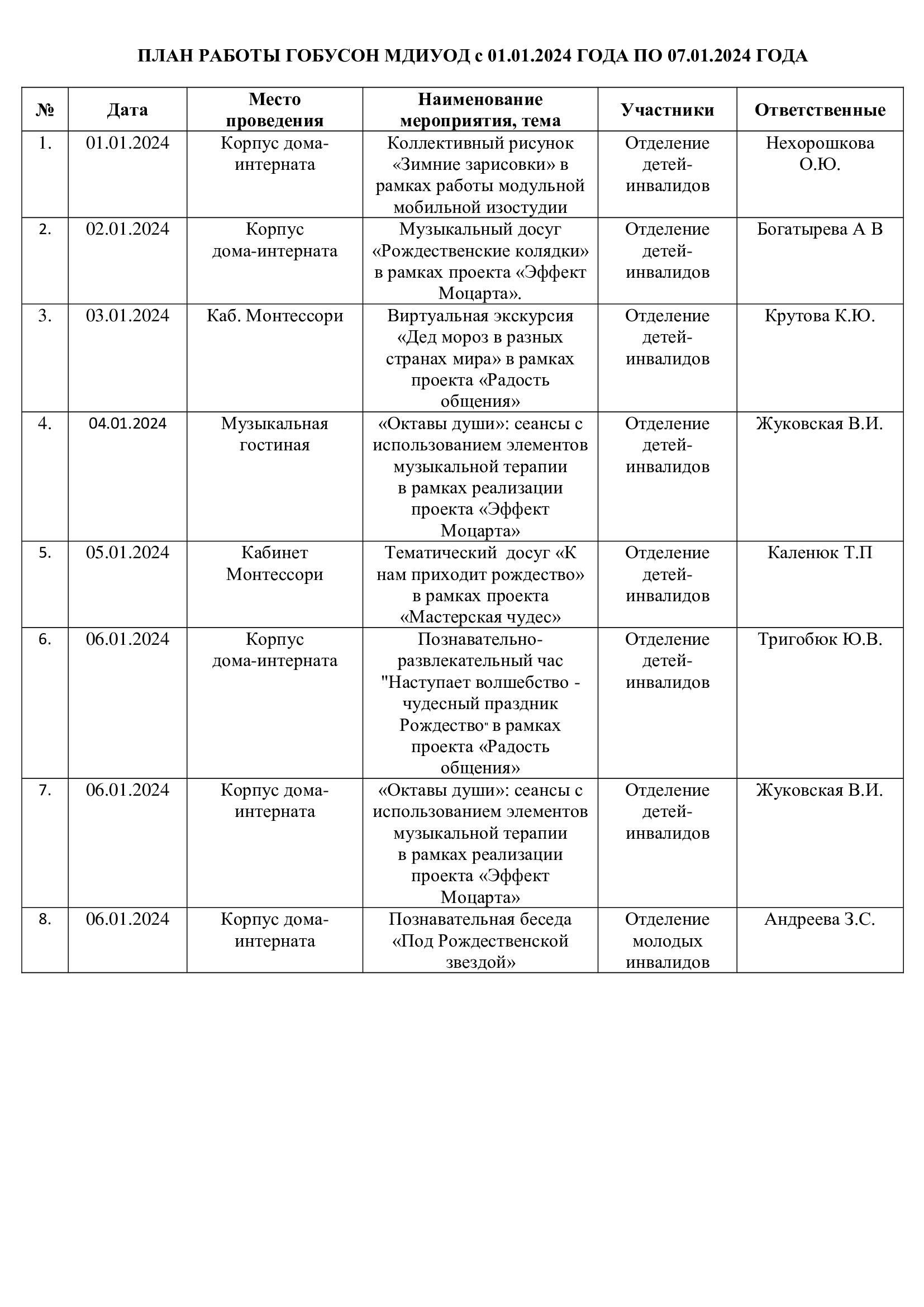 План работы ГОБУСОН МДИУОД с 01 января по 08 января 2024 года