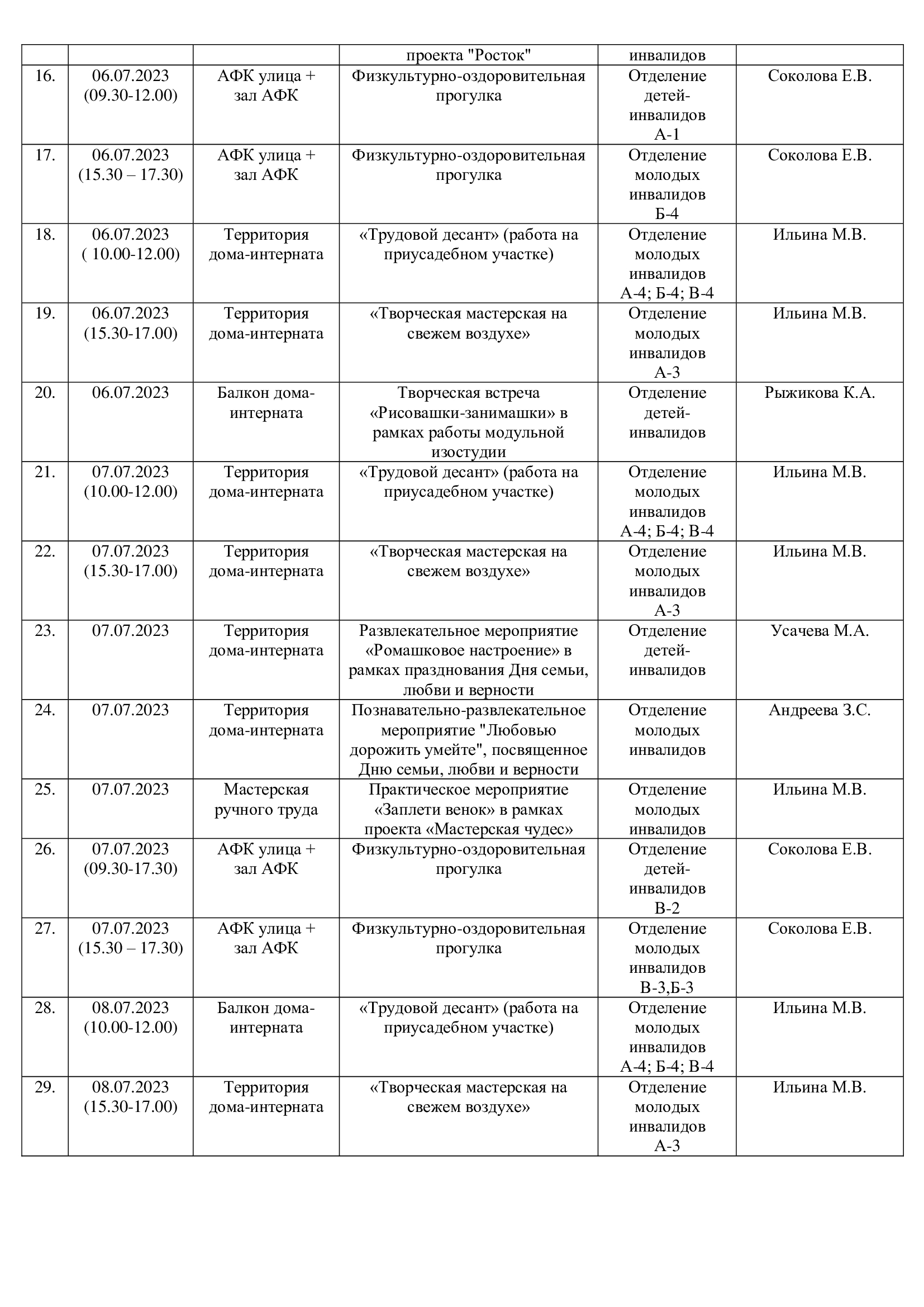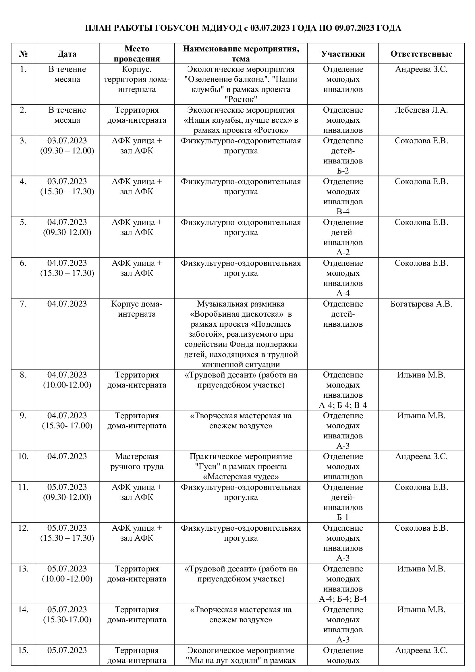 План работы ГОБУСОН МДИУОД с 03 июля 2023 года по 09 июля 2023 года