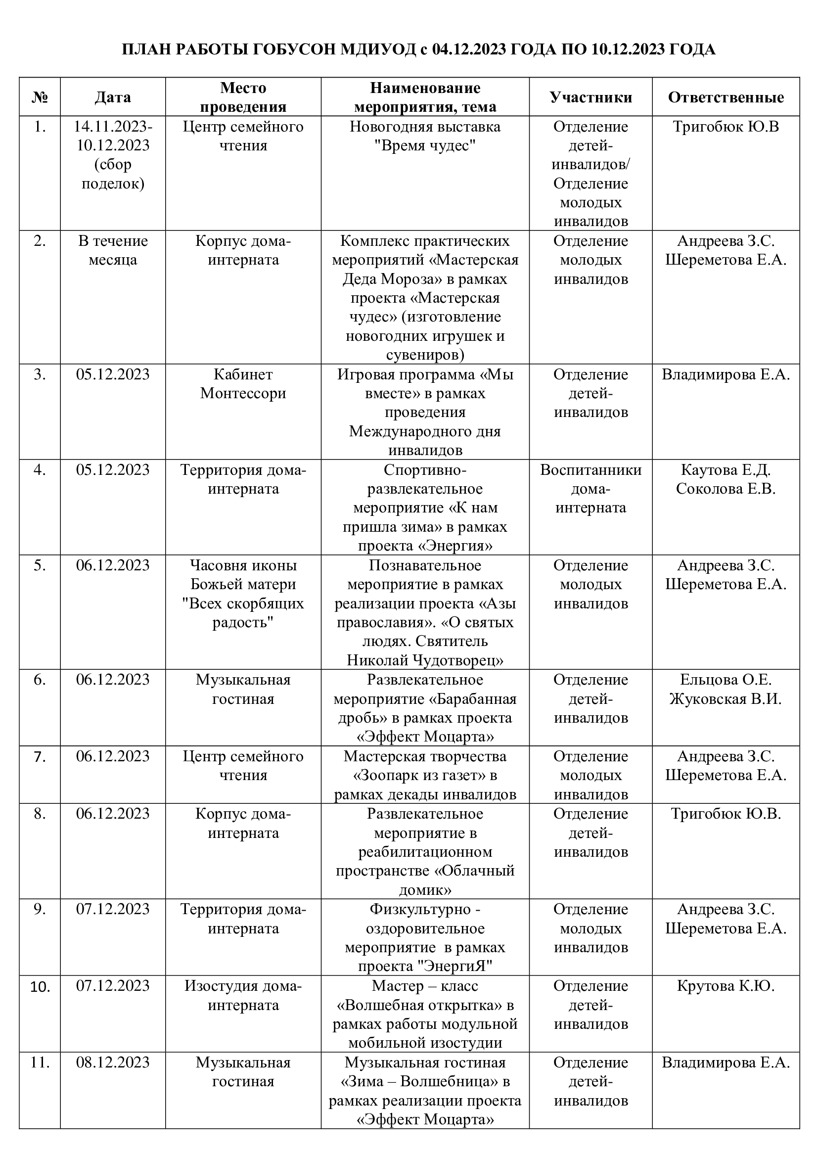 План работы ГОБУСОН МДИУОД с 04 декабря по 10 декабря 2023 года