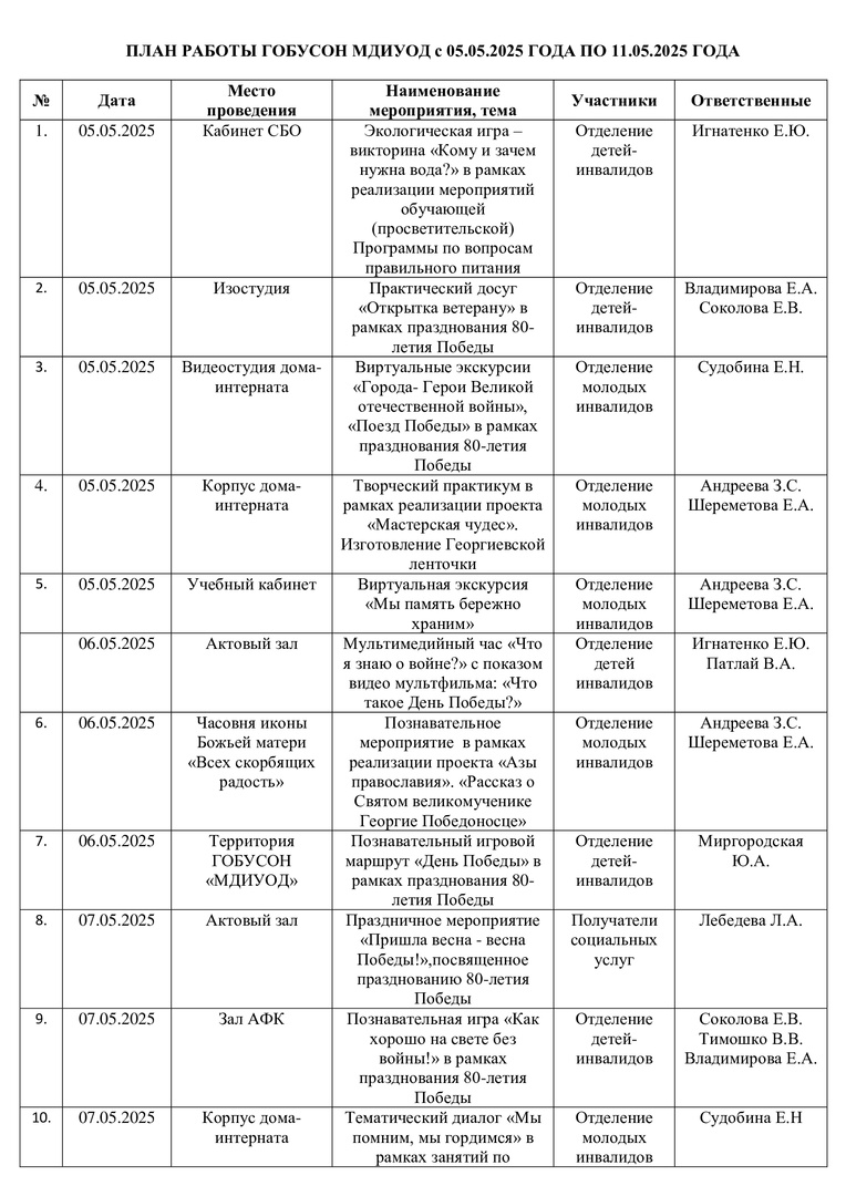 План работы ГОБУСОН МДИУОД с 05 мая 2025 года по 11 мая 2025 года