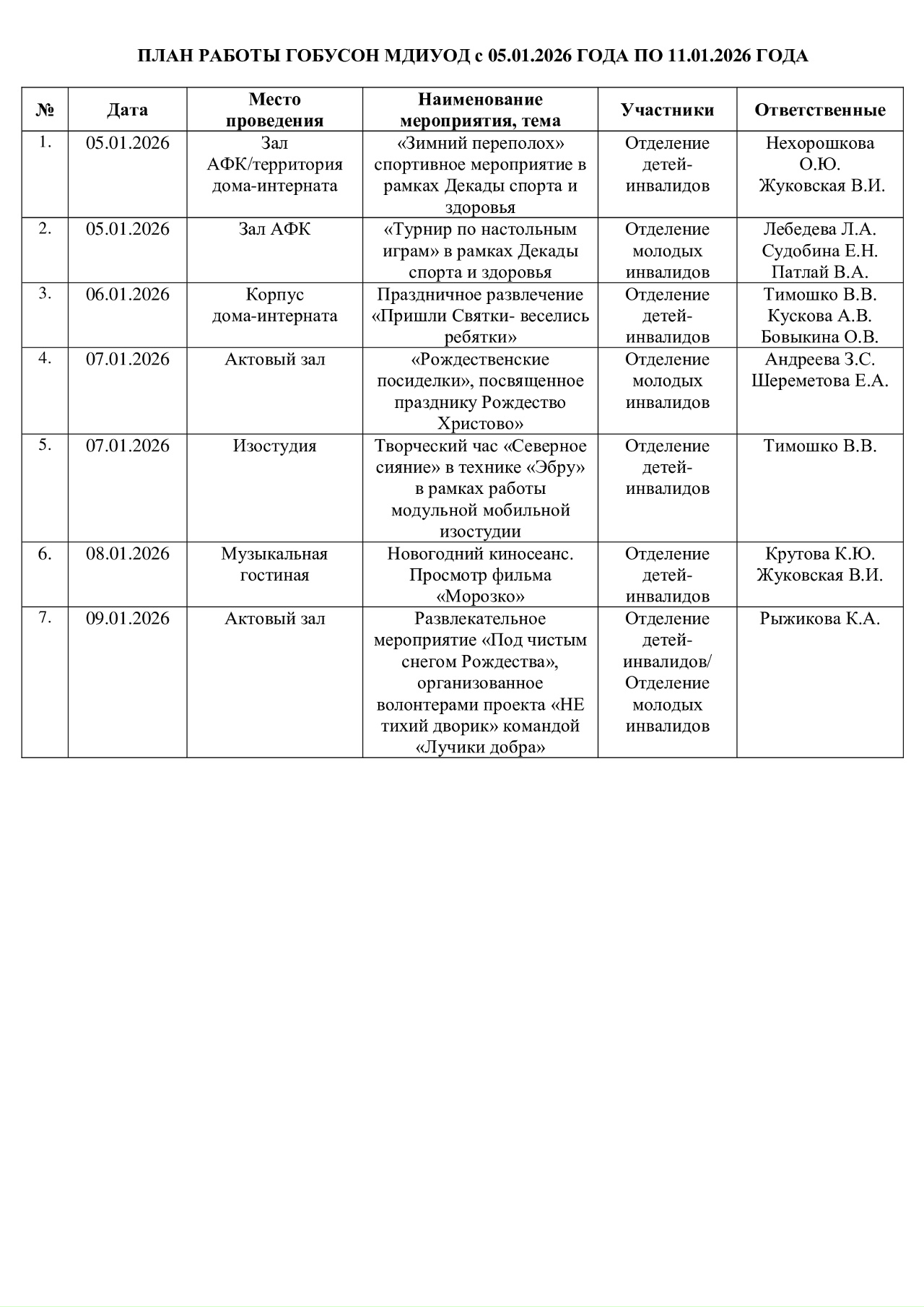 План работы ГОБУСОН МДИУОД с 05 января 2026 года по 11 января 2026 года