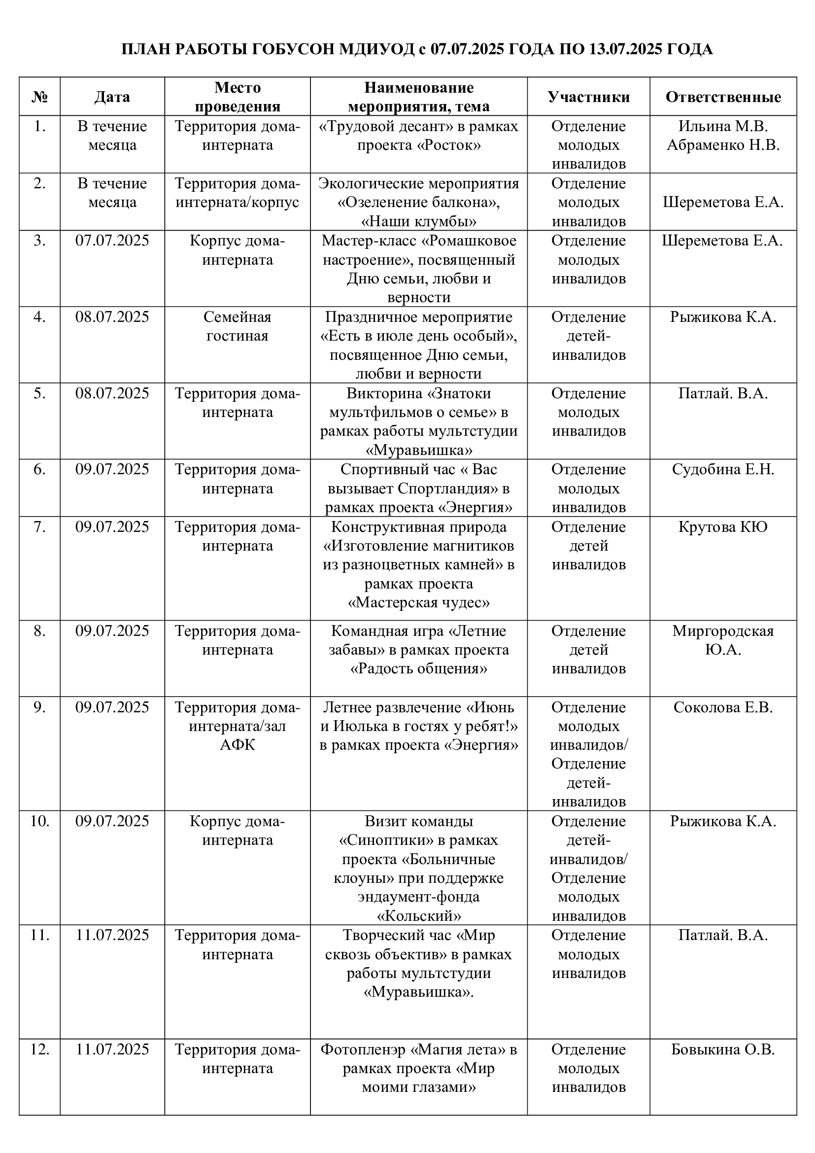 План работы ГОБУСОН МДИУОД с 07 июля по 13 июля 2025 года