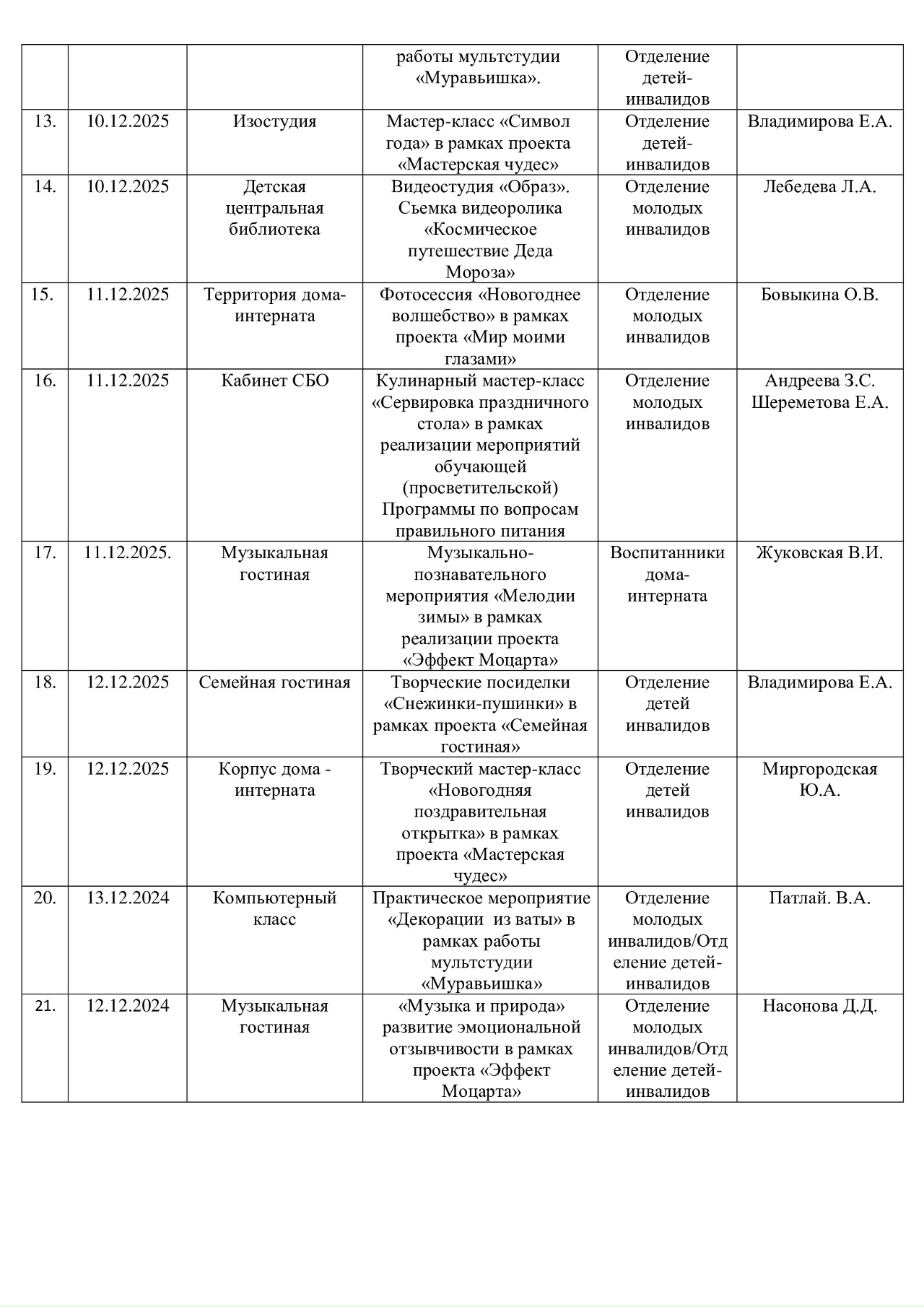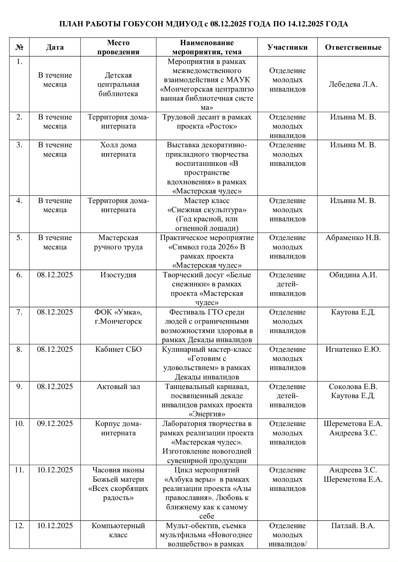 План работы ГОБУСОН МДИУОД с 08 декабря 2025 года по 14 декабря 2025 года
