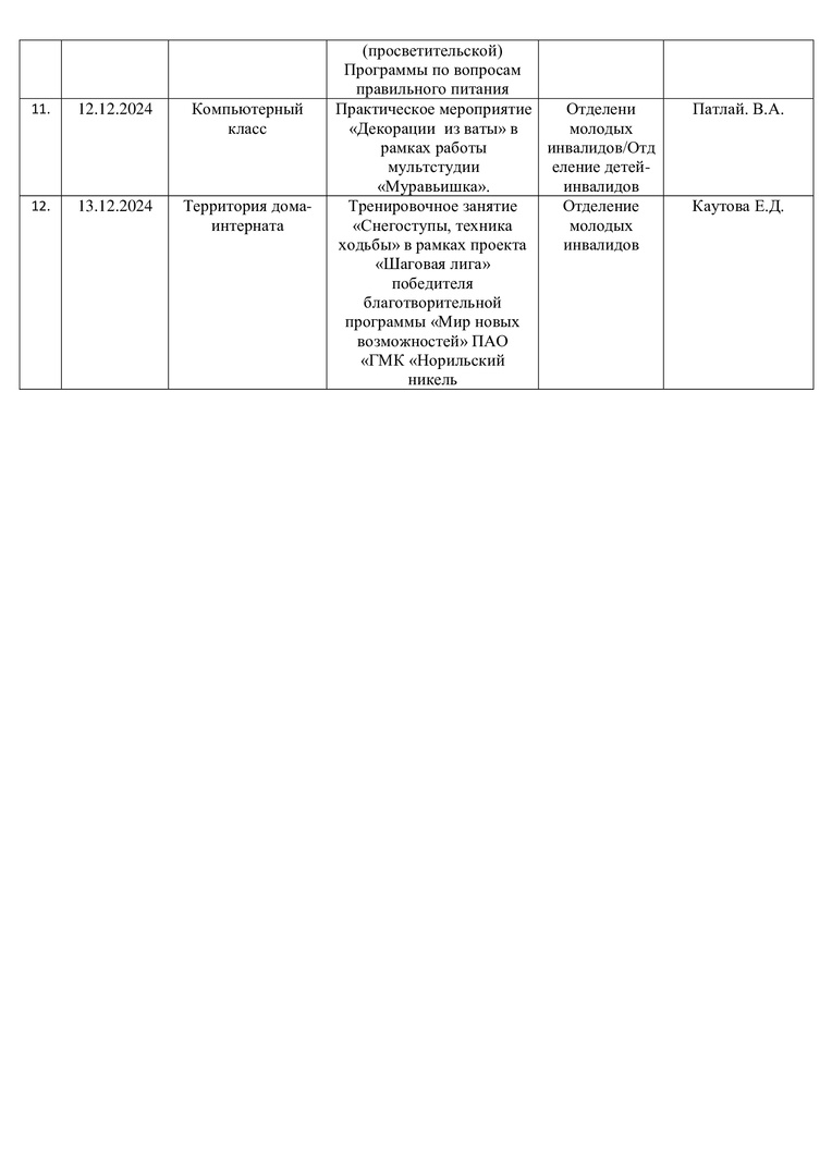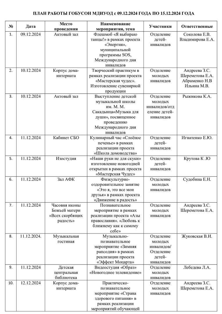 План работы ГОБУСОН МДИУОД с 09 декабря 2024 года по 16 декабря 2024 года