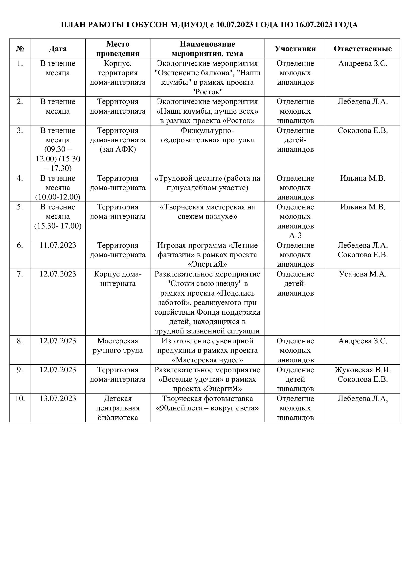 План работы ГОБУСОН МДИУОД с 10 июля 2023 года по 16 июля 2023 года