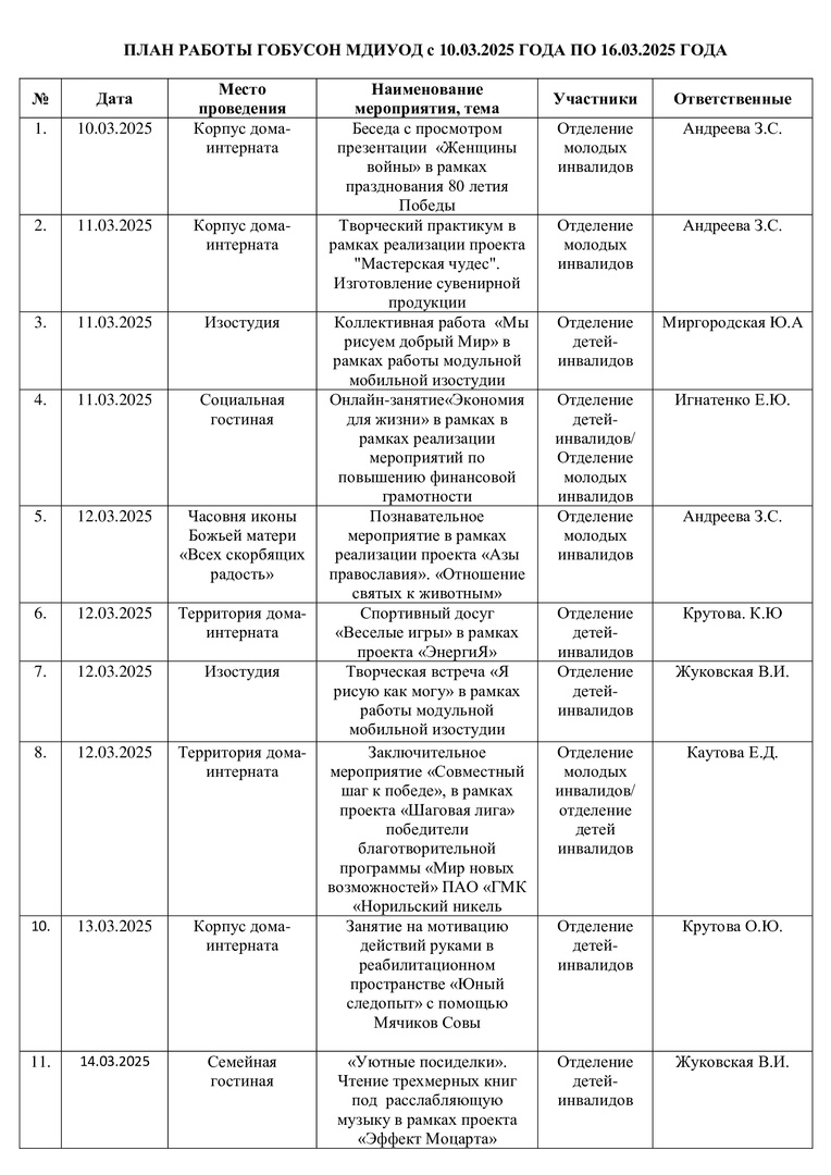 План работы ГОБУСОН МДИУОД с 10 марта 2025 года по 16 марта 2025 года