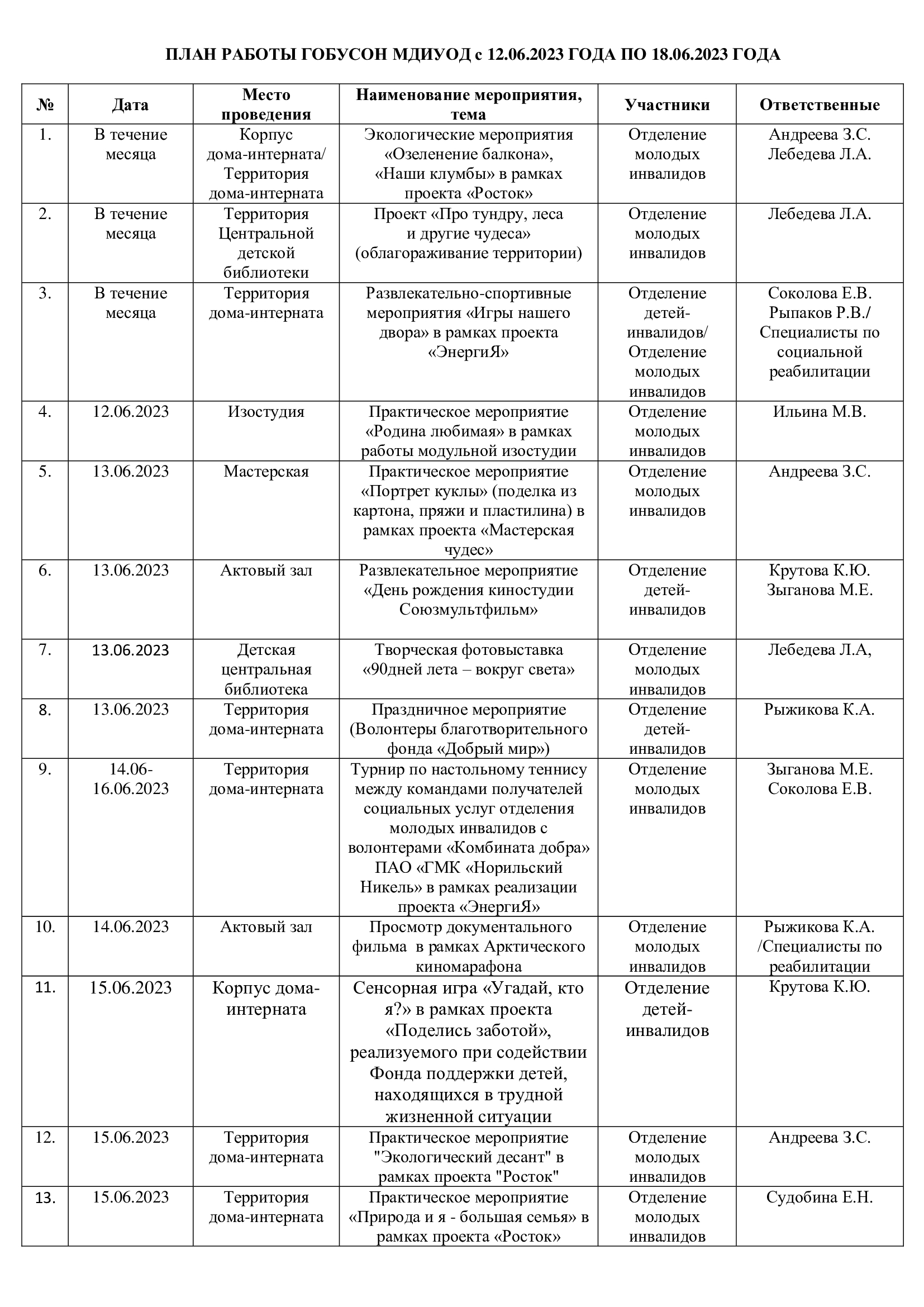 План работы ГОБУСОН МДИУОД с 12 июня по 18 июня 2023 года