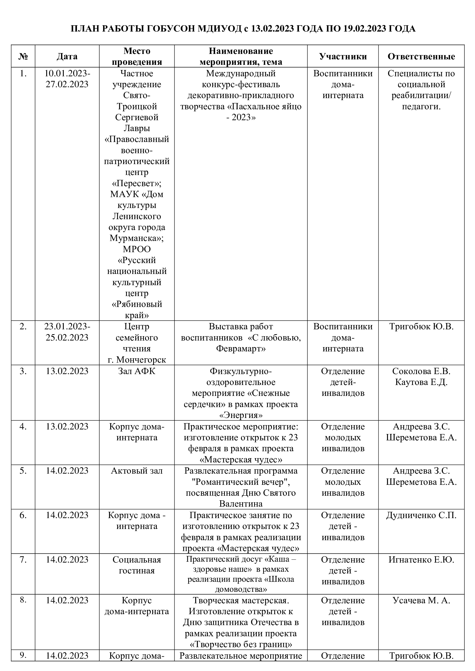 План работы ГОБУСОН МДИУОД с 13 февраля 2023 года по 19 февраля 2023 года