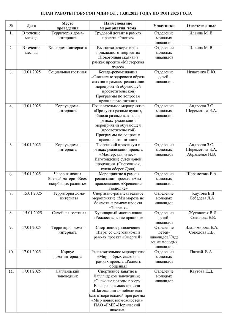 План работы ГОБУСОН МДИУОД с 13 января 2025 года по 19 января 2025 года