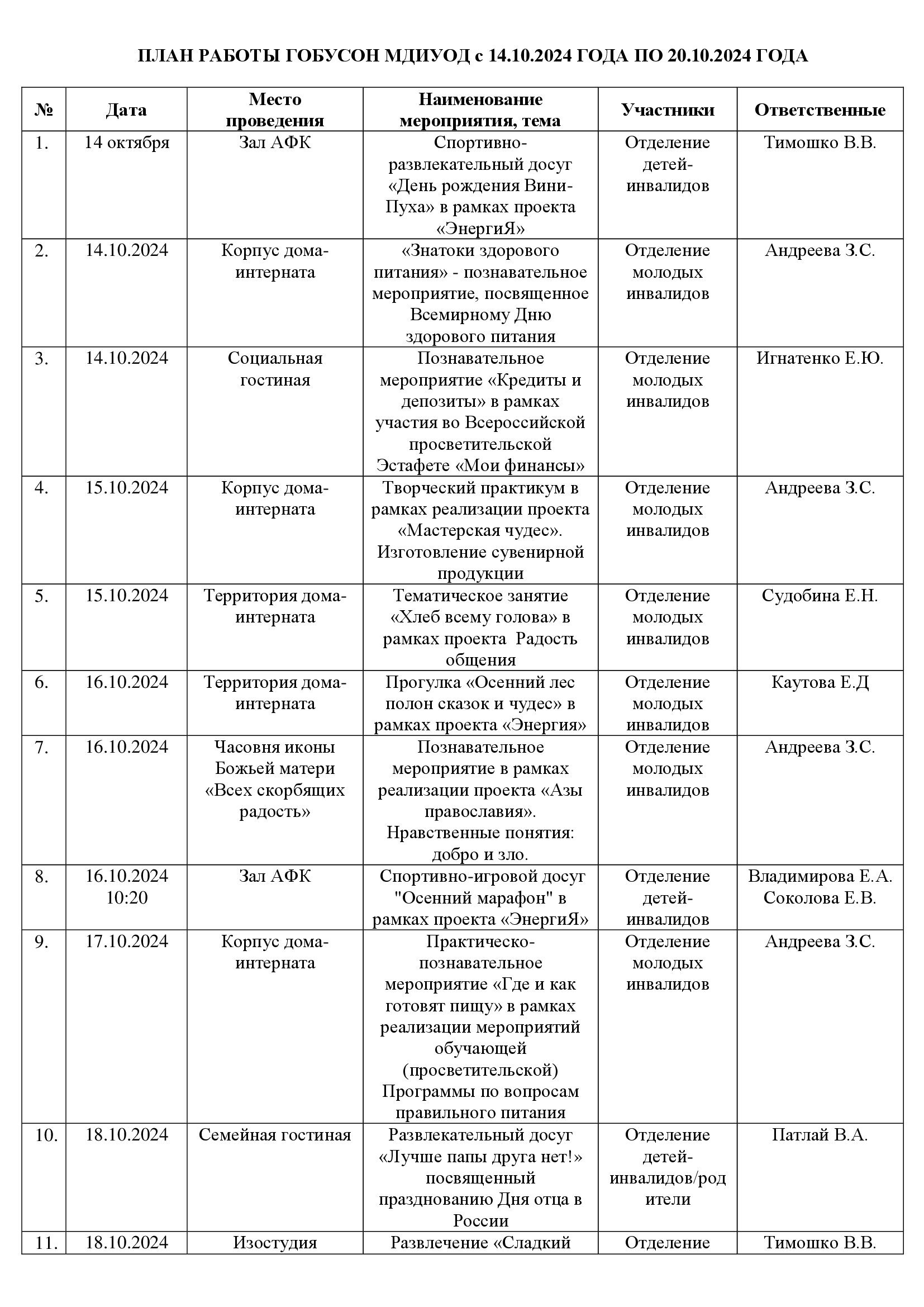 План работы ГОБУСОН МДИУОД с 14 октября по 20 октября 2024 года