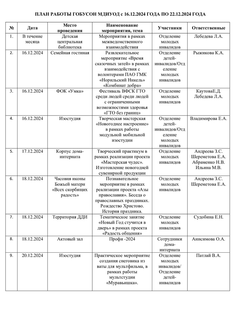 План работы ГОБУСОН МДИУОД с 16 декабря 2024 года по 22 декабря 2024 года
