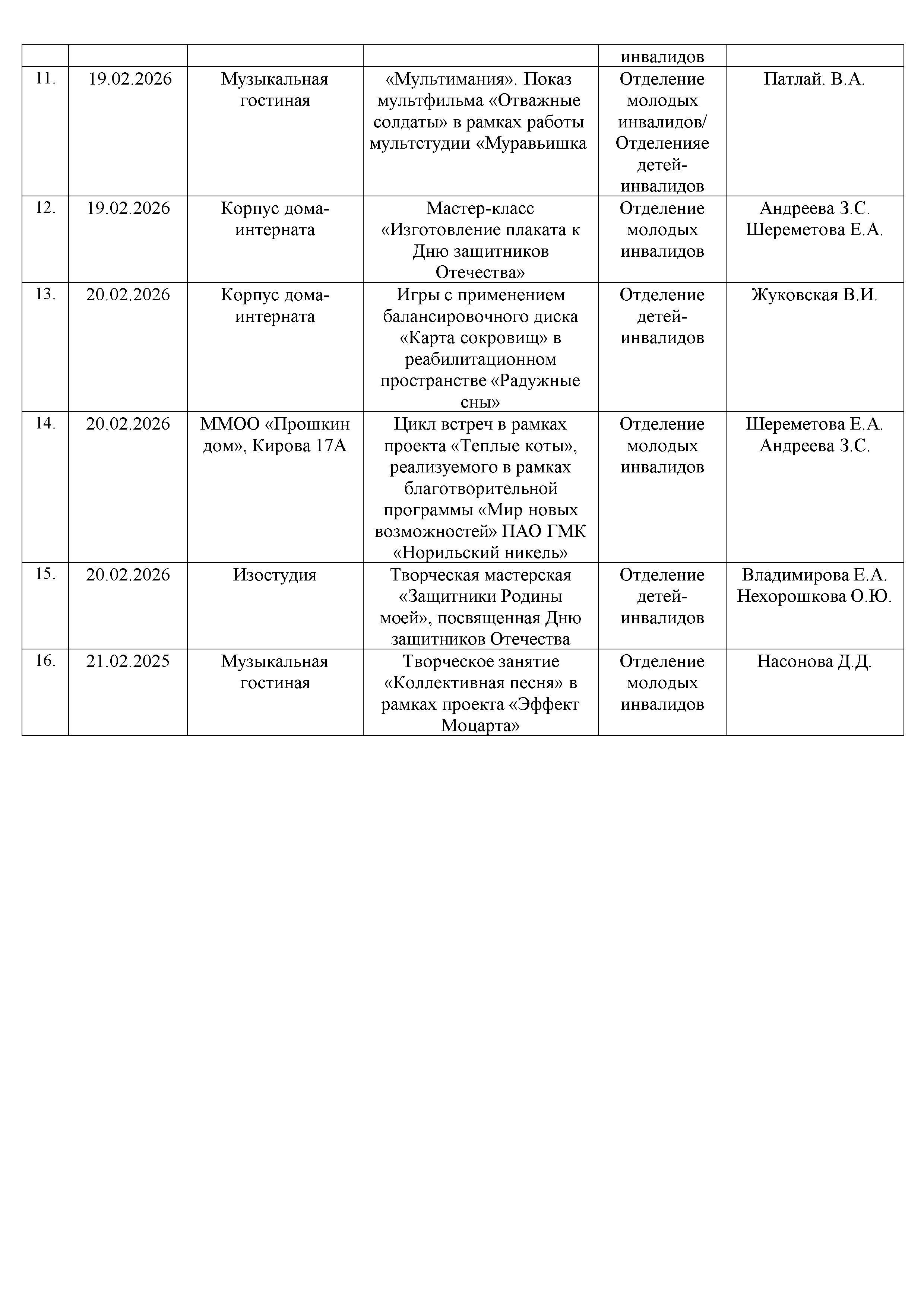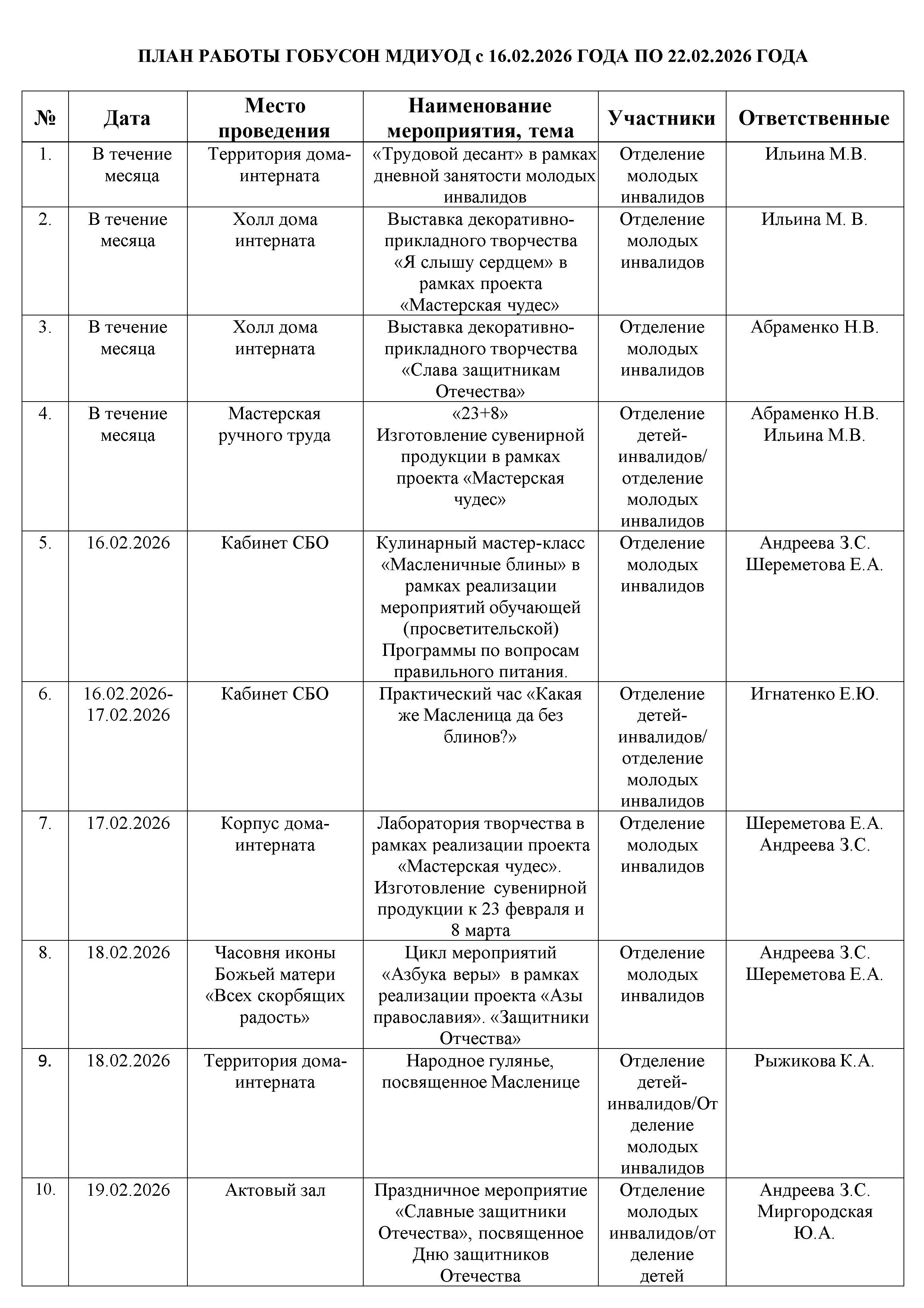 План работы ГОБУСОН МДИУОД с 16 февраля по 22 февраля 2026 года
