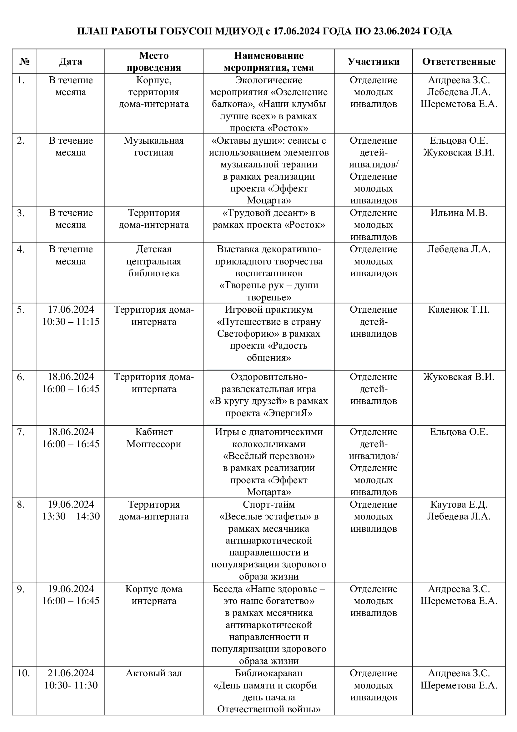 План работы ГОБУСОН МДИУОД с 17.06.2024 по 23.06.2024